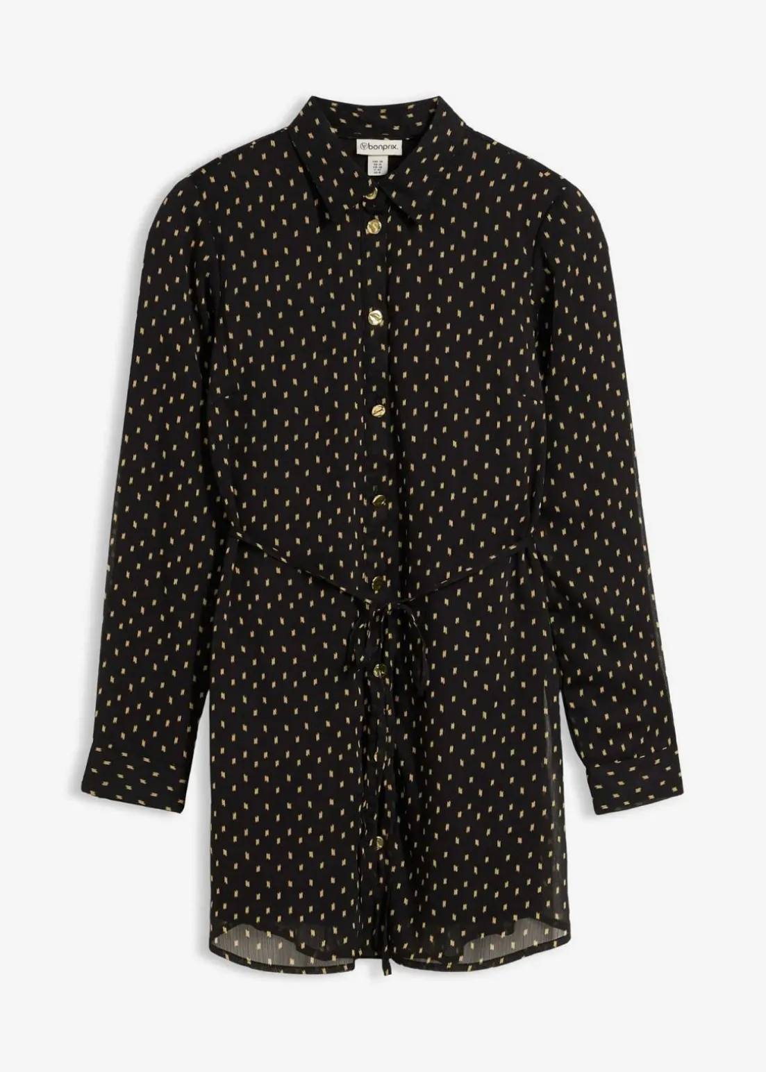 Die lang geschnittene Umstands-Bluse bietet großzügigen Platz für den wachsenden Bauch. Sie ist mit einem weichen Baumwollfutter ausgestattet, verfügt über einen klassischen Hemdkragen und eine durchgehende Knopfleiste. Diese ist mit dekorativen Knöpfen verziert, die ein einfaches Stillen sowie ein bequemes An- und Ausziehen ermöglichen. Das abnehmbare Bindeband setzt einen schönen Akzent und betont den wachsenden Babybauch.