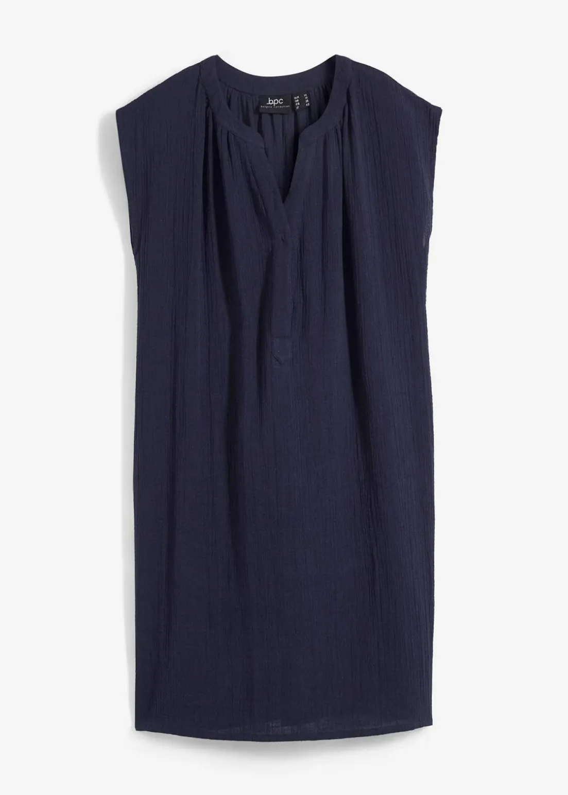 Bequem geschnittenes Schwangerschaftskleid aus reiner Baumwolle, ohne Ärmel und mit überschnittenen Schultern. Der V-Ausschnitt mit einer langen, verdeckten Knopfleiste ermöglicht ein komfortables Stillen.