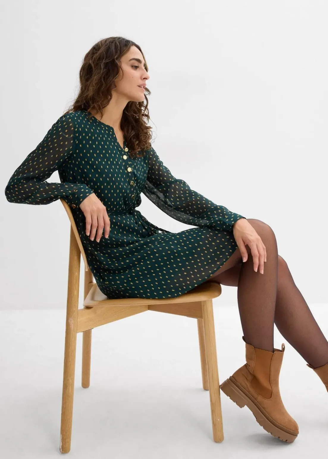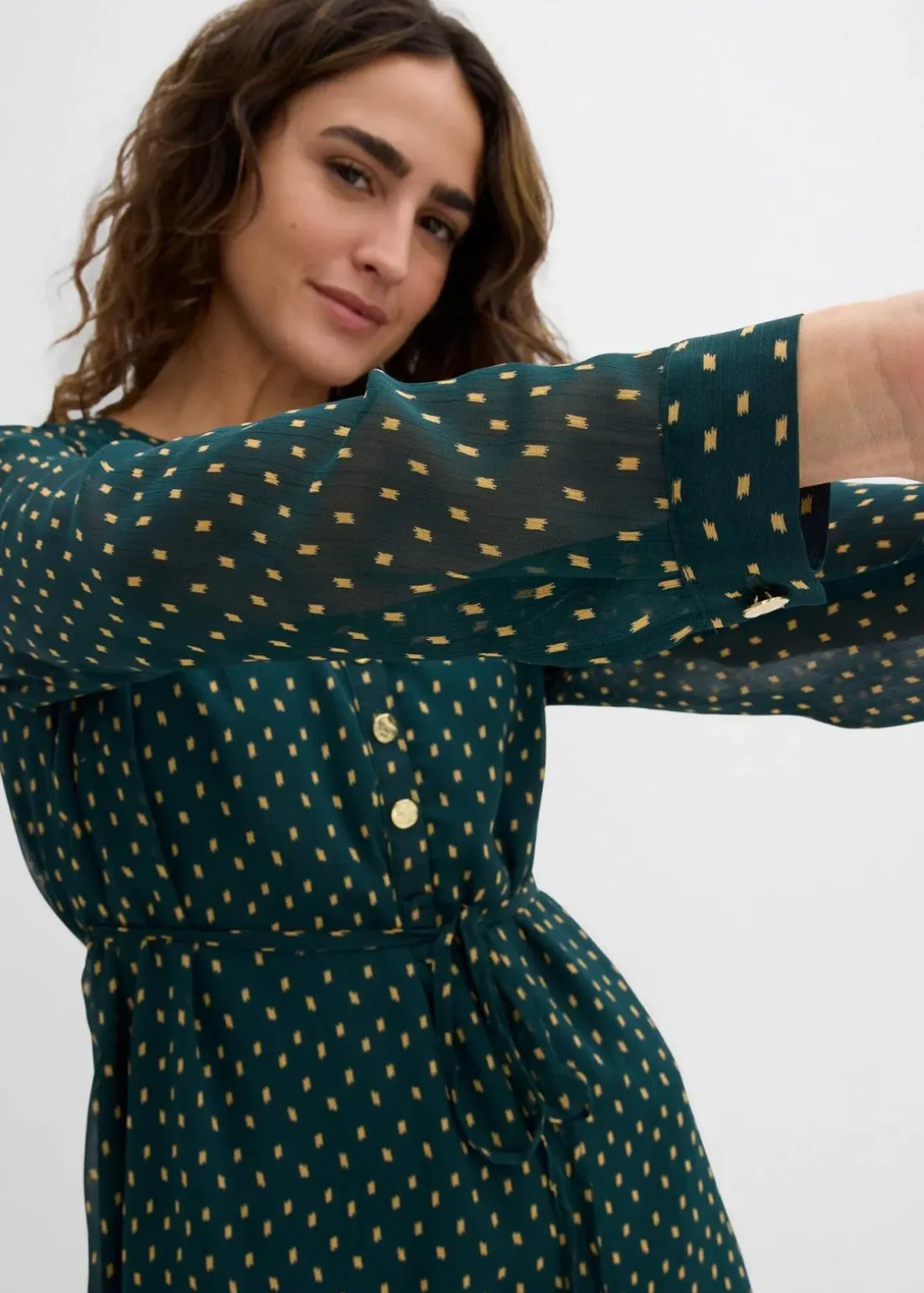 Gefüttertes Chiffon-Kleid mit langen, halbtransparenten Ärmeln und Rundhalsausschnitt mit kleinem Stehkragenkragen. Das abnehmbare Bindeband betont den wachsenden Baby-Bauch. Nach der Schwangerschaft ist ein einfaches Stillen durch die, mit goldenen Knöpfen verzierte, Knopfleiste möglich. Leicht abgerundeter Saum. Ärmel mit Manschette und goldenem Knopf.