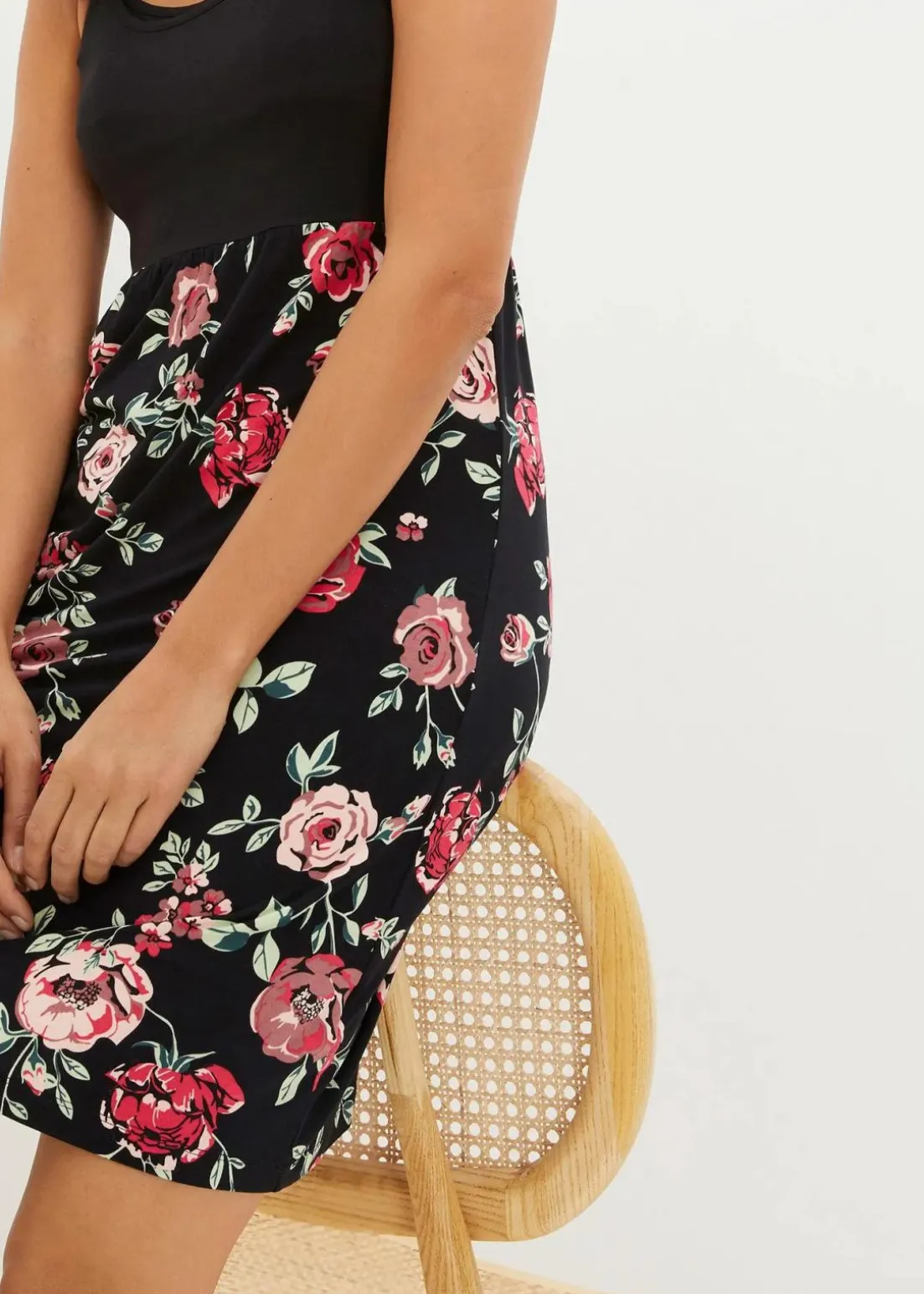 Stillkleid aus weichem Viskosejersey mit schmalen verstellbaren Trägern und einem funktionellen Verschluss, der das Stillen erleichtert. Darunter befindet sich ein weiches Innentop mit elastischem Saum. Leicht ausgestellter Rock mit Blumendruck.