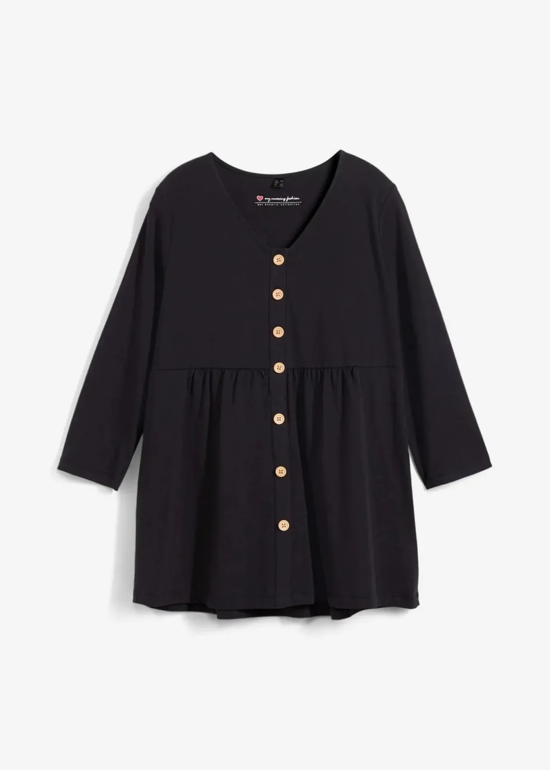 Weiches Umstandsshirt aus elastischem Jersey aus Bio-Baumwolle. Mit Rundhals-Ausschnitt und 3/4 Ärmeln. Die dekorativen Knöpfe ermöglichen ein einfaches Stillen.