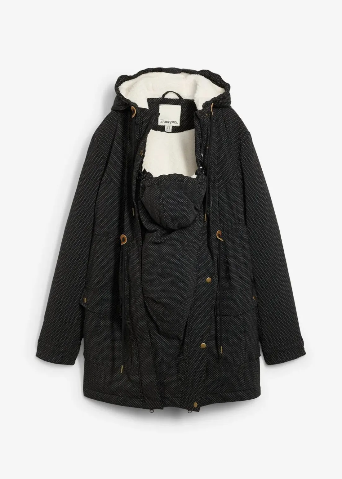 Seitliche Reißverschlüsse bieten zusätzliche Weite und ermöglichen die Jacke auch nach der Schwangerschaft weiterhin zu tragen. Ein abnehmbarer Trageeinsatz mit Kapuze schützt das Baby vor Wind und Wetter. Mit Zweiwegereißverschlus und Stehkragen mit Druckknöpfen. Mit einer Kapuze und Kordelzug unterhalb der Brust mit Kordelstoppern. Große, aufgesetzte Taschen und verstellbare Ärmelabschlüsse.