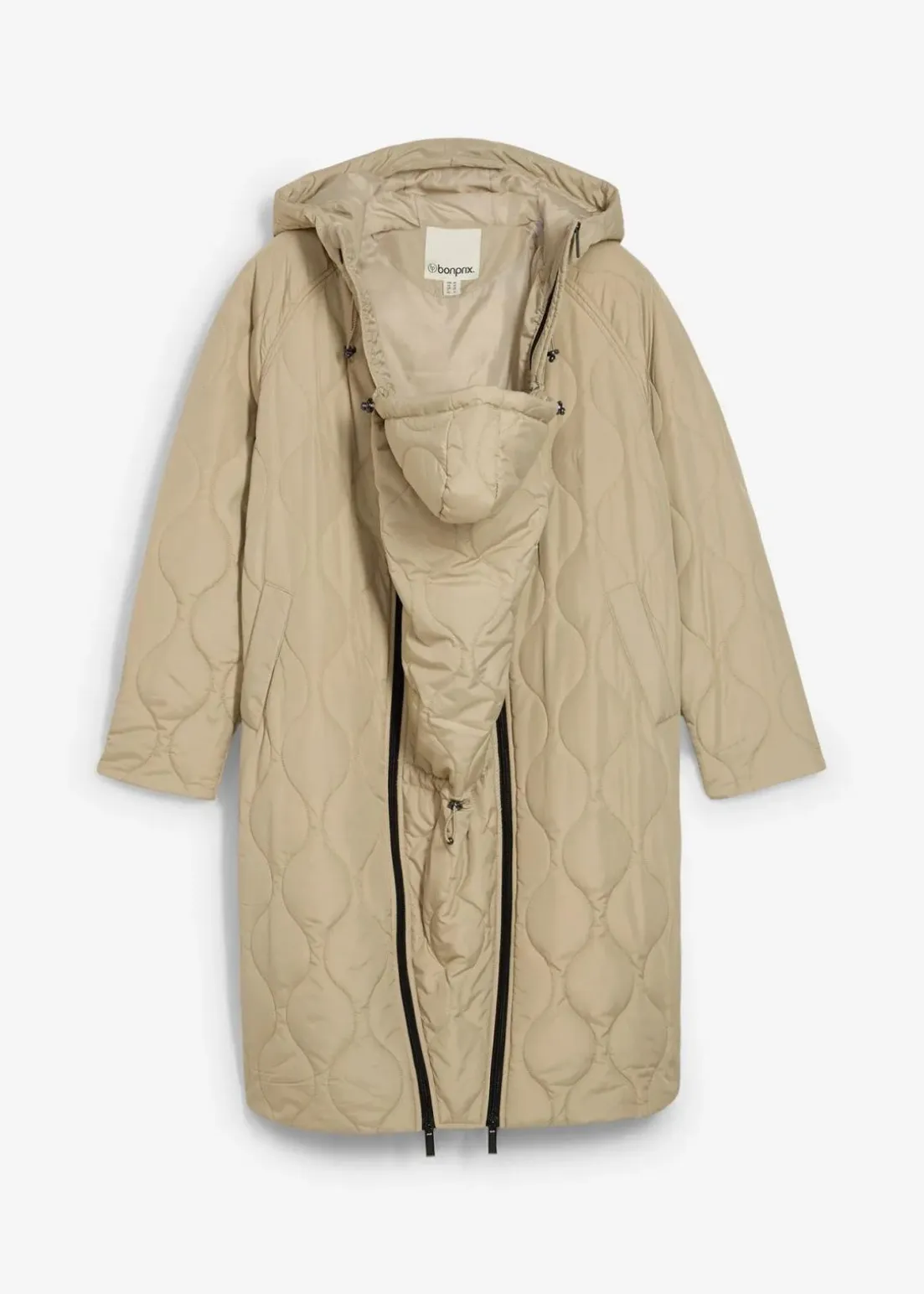 Praktischer Übergangsmantel in knieumspielender Länge mit funktionalen Kapuzen für Mutter und Baby, jeweils ausgestattet mit verstellbaren Kordelzügen. Druckknöpfe an den Seitennähten ermöglichen eine flexible Weitenanpassung und bieten so optimalen Komfort während der Schwangerschaft und danach.