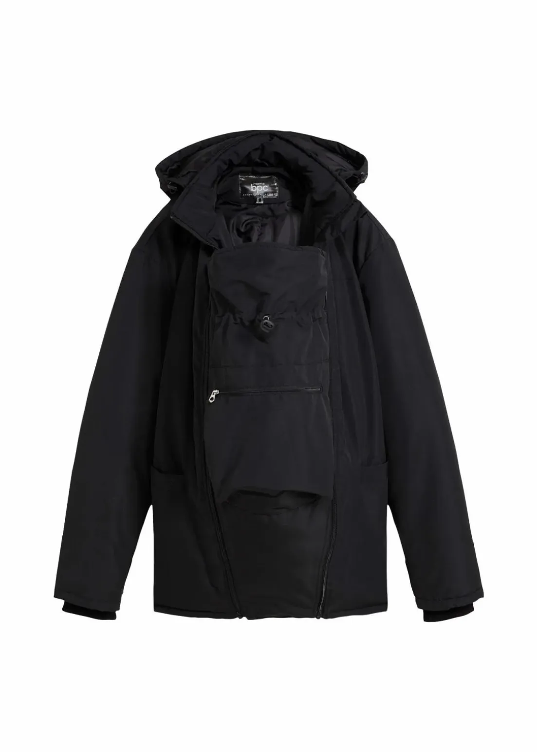 Regen- und windabweisende Funktionsjacke mit einem Trageeinsatz für das Baby. Dieser hat eine praktisch platzierte Tasche für Babybedarf. Weiche Rippbündchen an den Ärmeln verhindern das Eindringen von Kälte und Wind. Mit Taschen vorne und einer abnehmbaren Kordelzugkapuze. Seitliche Reißverschlüsse dienen der Regulierung der Weite, die das Tragen sowohl in als auch nach der Schwangerschaft ermöglichen.