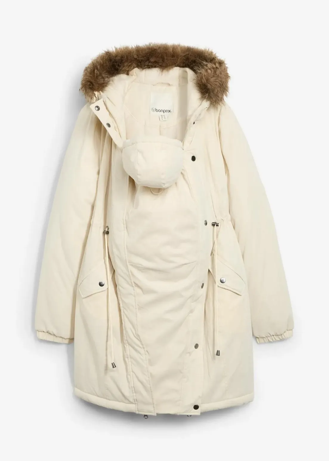 Seitliche Reißverschlüsse bieten zusätzliche Weite und ermöglichen die Jacke auch nach der Schwangerschaft weiterhin zu tragen. Ein abnehmbarer Trageeinsatz mit Kapuze schützt das Baby vor Wind und Wetter. Mit Zweiwegereißverschluss, Stehkragen mit Druckknöpfen, Kapuze mit abnehmbarem Kunstfell. Kordelzug unterhalb der Brust mit Kordelstoppern. Aufgesetzte Taschen und elastische Ärmelabschlüsse.