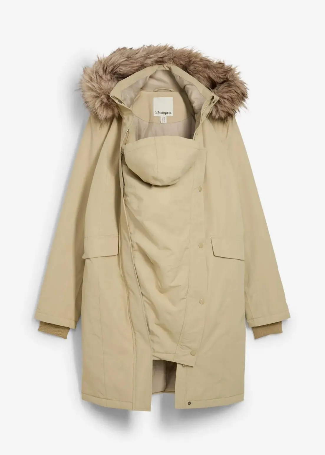 Mittelwarm wattierter Umstandsmantel aus wind- und wasserabweisendem Funktionsstoff. Seitliche Reißverschlüsse bieten zusätzliche Weite und ermöglichen die Jacke nach der Schwangerschaft weiterhin zu tragen. Ein abnehmbarer Trageeinsatz mit Kapuze schützt das Baby vor Wind und Wetter. Mit Stehkragen mit Druckknöpfen, Kapuze mit abnehmbarem Fellkragen. Große, warm gefütterte Taschen und Ärmelabschlüsse aus Baumwollripp.