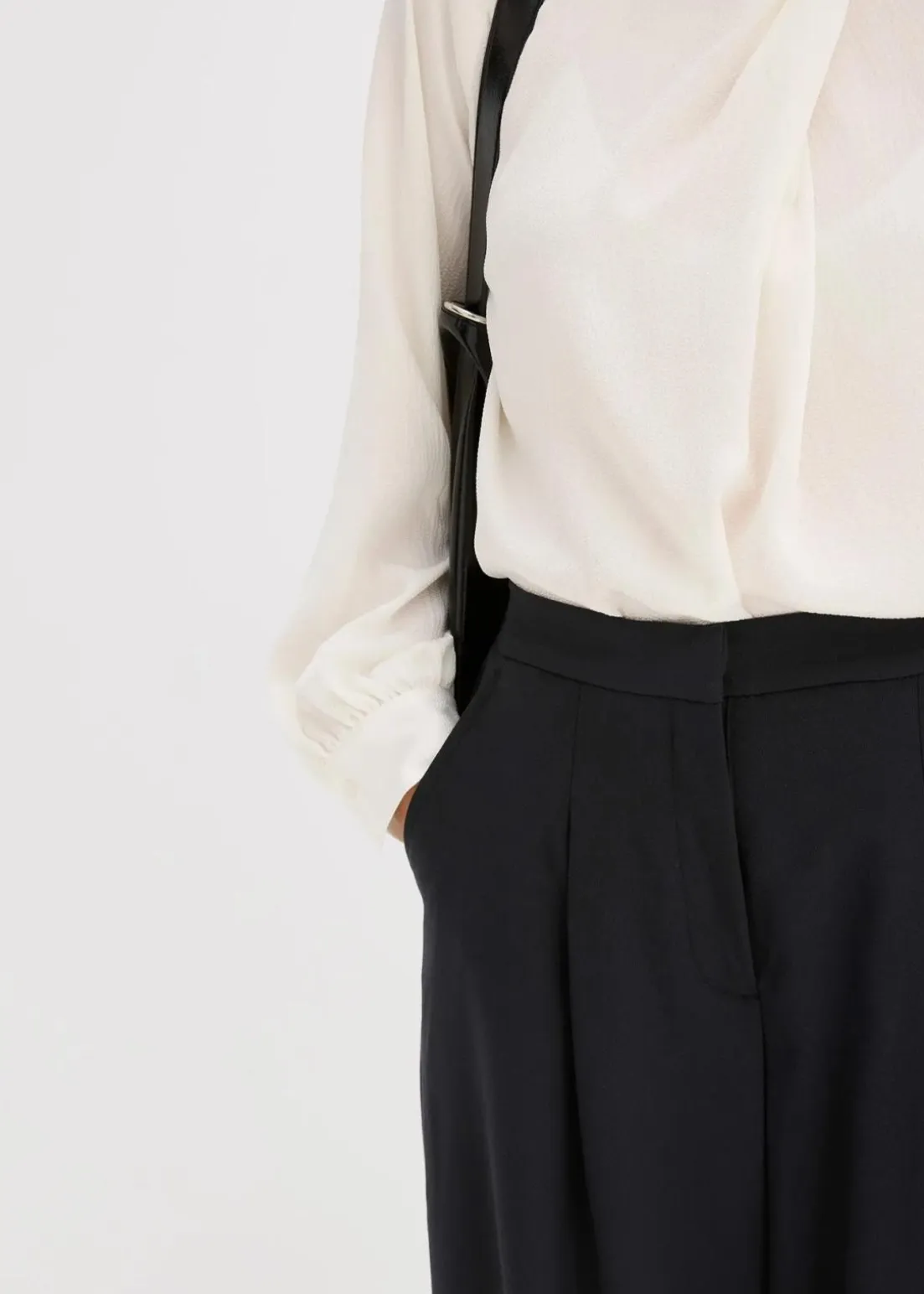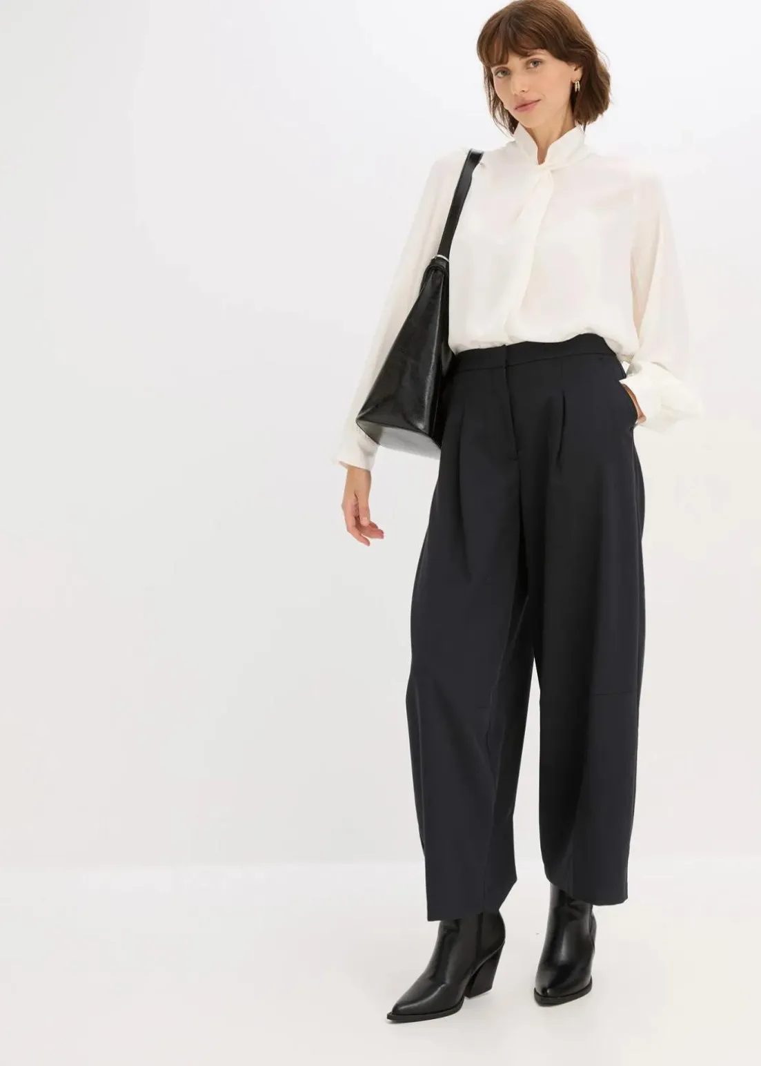 Bundfalten Hose in leichter Barrelform mit seitlichen Taschen sowie teilelastischem Bund mit Zip Fly und verdecktem Häkchenverschluss vorn.