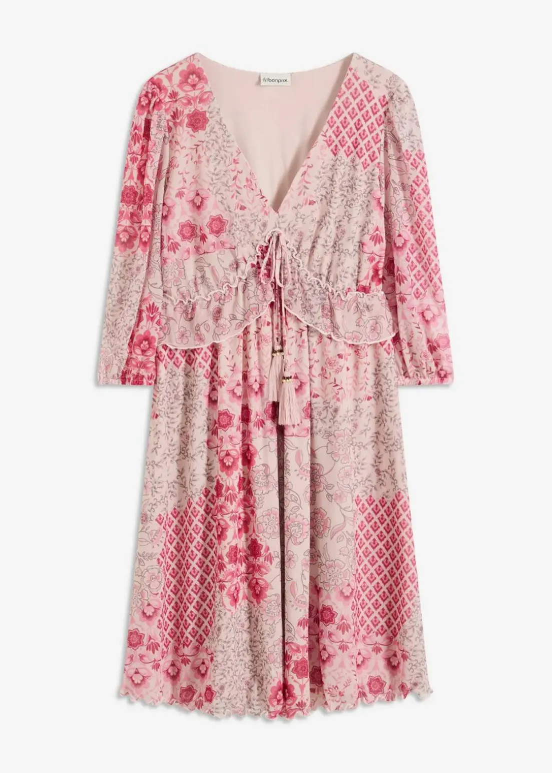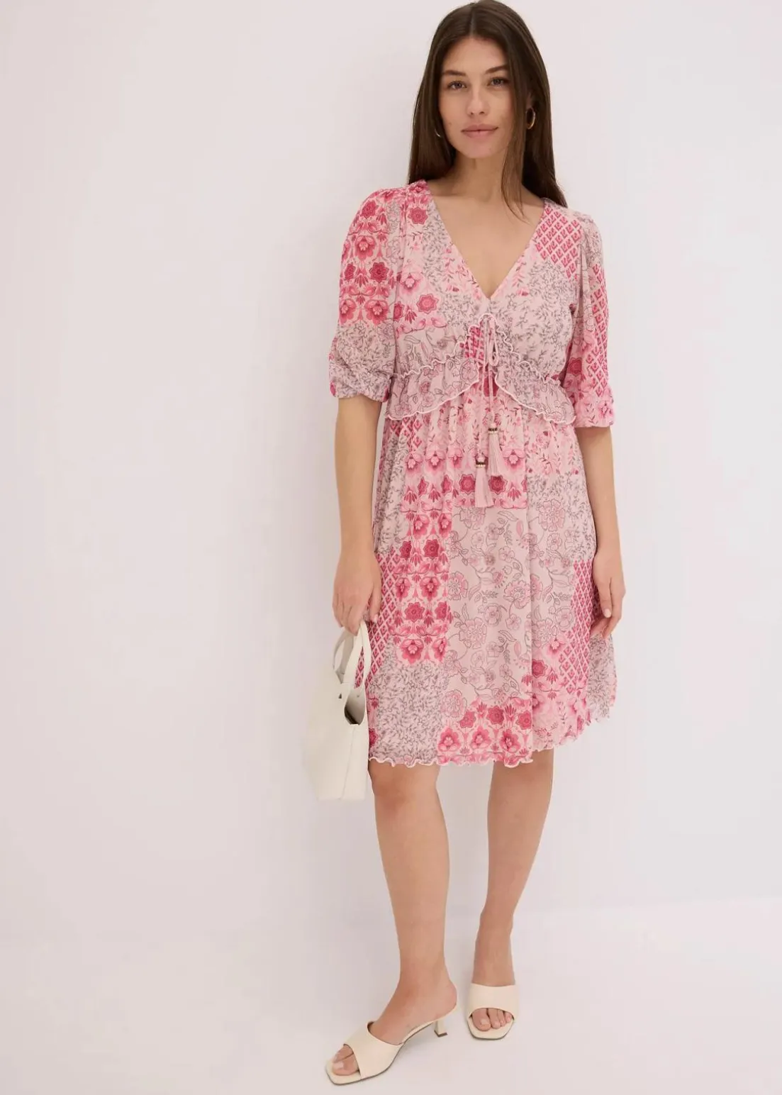 feminines Mesh-Tunika-Kleid mit kleinem Volant und dekorativem Bindeband vorne in der Taille