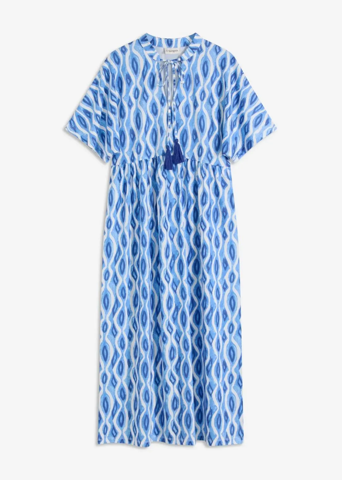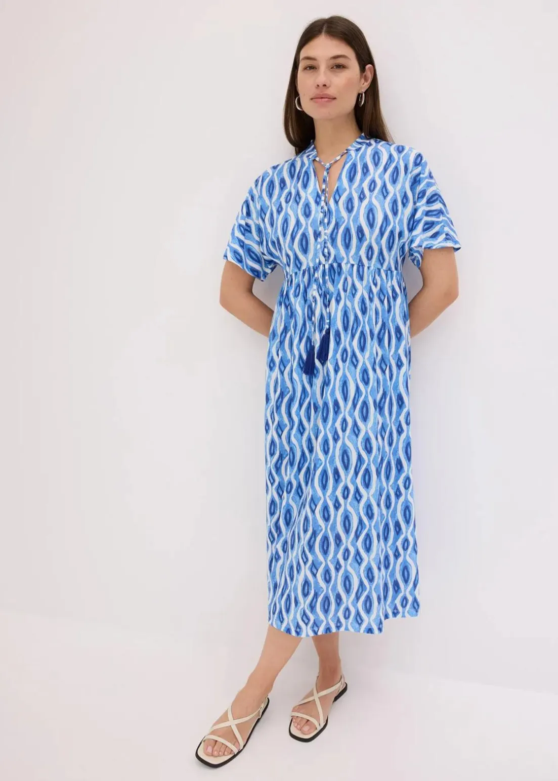 sommerlich bedrucktes Tunika-Kleid in Midilänge mit Bindebändern vorne am Ausschnitt und weiter geschnittenen Ärmeln.