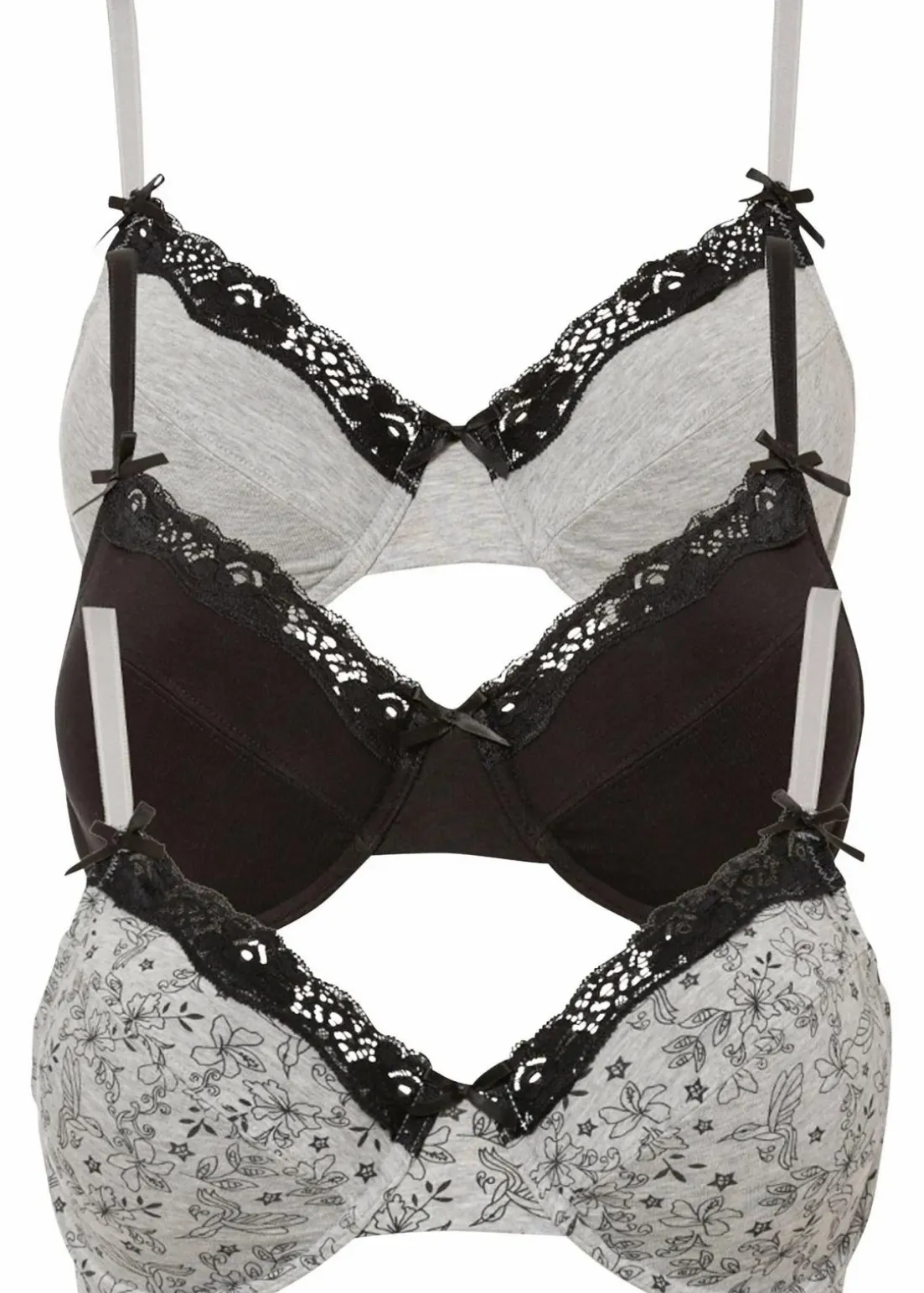Drei attraktive Bügel-BHs der Marke bpc bieten durch eine ausgewogene Mischung von Baumwolle und Elasthan einen angenehmen Tragekomfort. Gleichzeitig sorgt der eingearbeitete Bügel für optimalen Halt. Auch ohne Schale wird die Brust optimal in ihre natürlich Form gebracht.In dem Pack sind zwei verschiedene, einfarbige BHs enthalten. Dazu ist ein BH mit einem bezaubernden floralen Muster verziert. Alle BHs sind an der oberen Cupkante mit einer schönen, elastischen Spitze geschmückt