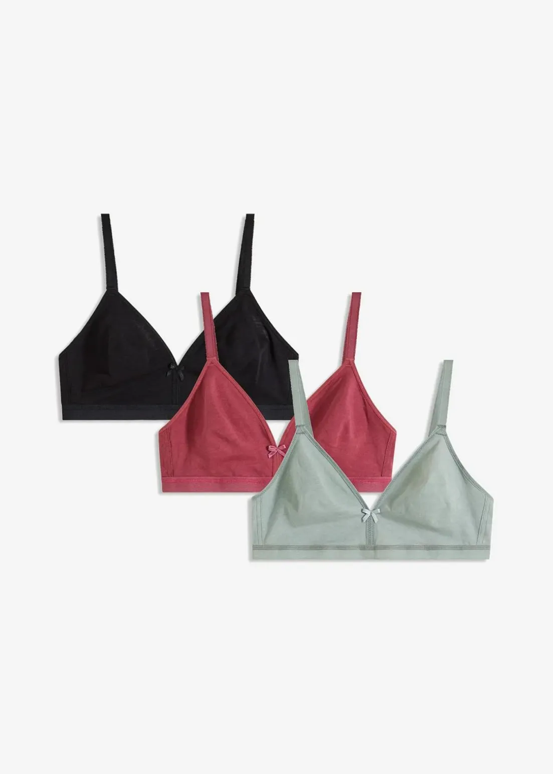 Durch seine nahtlos vorgeformten Cups und die Bio-Baumwolle sitzt der BH angenehm weich auf der Haut, ohne dabei zu drücken. Hoher Schnitt der Cupform sowie schmale Träger sorgen zusätzlich für ein schönes Dekolleté. Ein dezenter Hingucker findet sich in der Schleife am Mittelsteg.Der BH von bpc kommt ohne Bügel aus und eignet sich so ideal zum Tragen unter figurbetonenden Tops oder T-Shirts. Im 3er-Pack ist die Wäschemode in den Varianten 2x weiß und 1x hellblau, 2x schwarz und 1x aubergine sowie 1x schwarz, 1x weiß und 1x rot erhältlich.