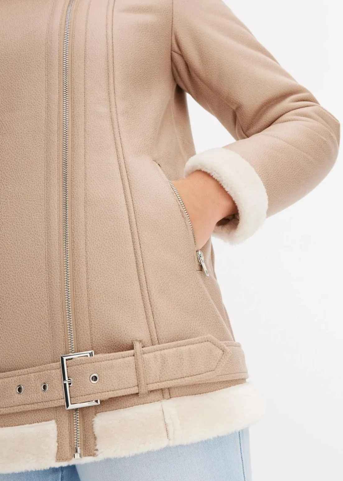 Lange Shearling-Jacke mit Fellimitat und dekorativem Gürtel
