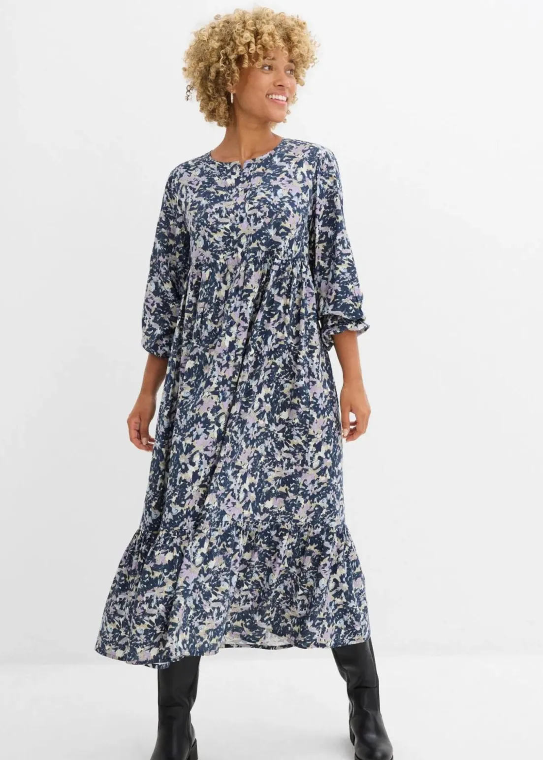 Blusenkleid in leichtem A-Linien-Schnitt. Mit elastischem Abschluss am Ärmelbund und floralem Print.