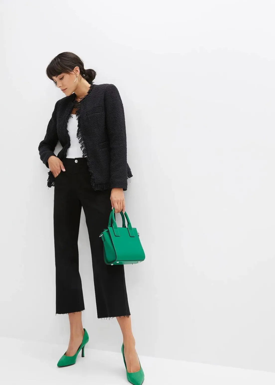Modische Bouclé-Jacke mit dekorativen Fransen verziert.