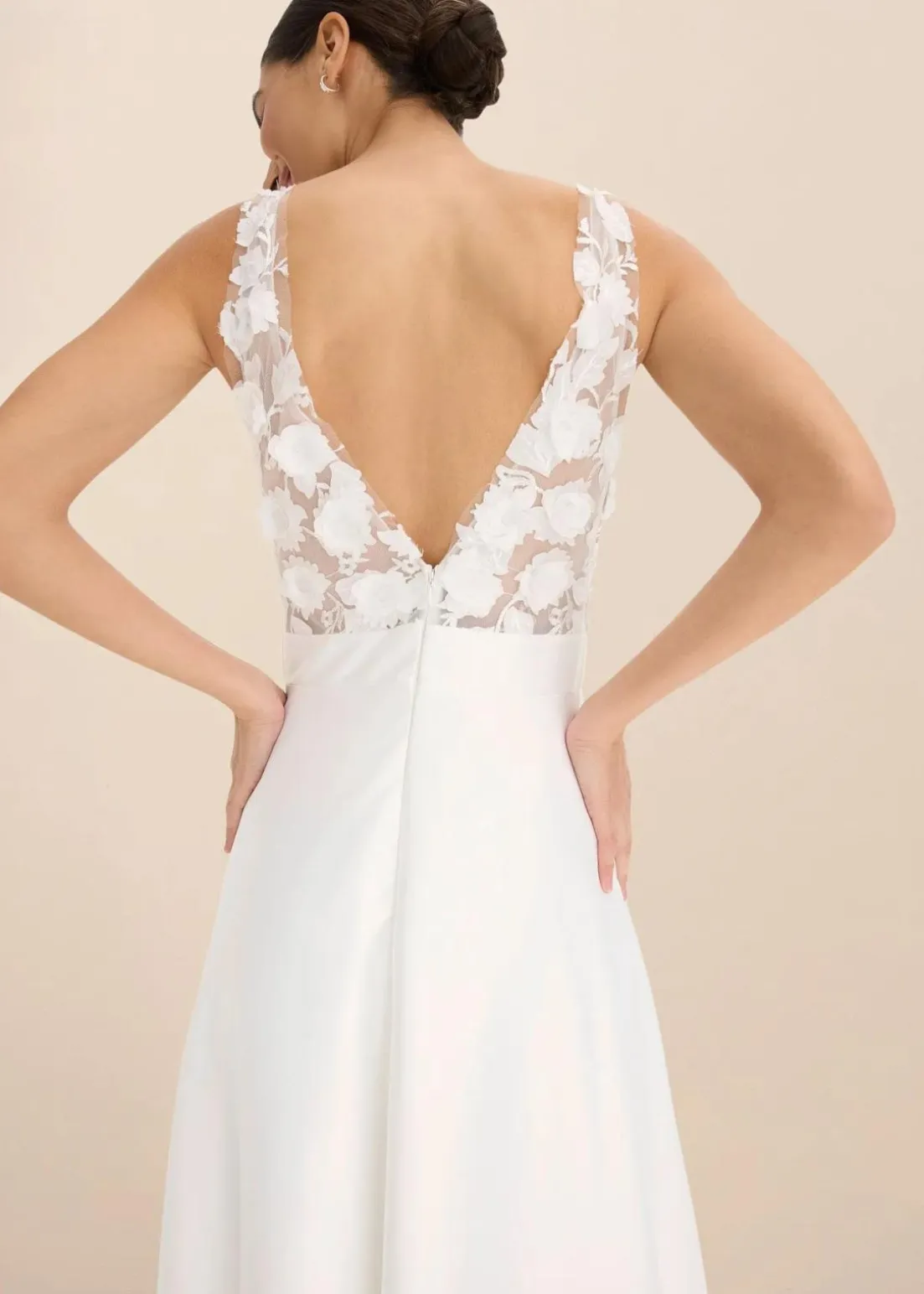 Modern und feminin: Langes Brautkleid aus glänzendem Satin mit hohem Schlitz und Blumen-Applikation im Oberteil
