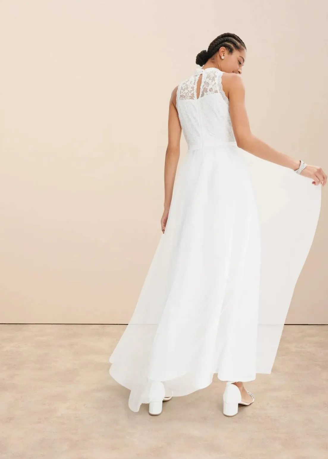 Romantisches Brautkleid mit Stehkragen und Corsagen-Optik aus Spitze.