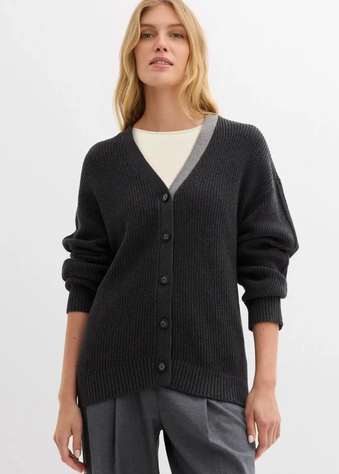 Loose-Fit Cardigan mit V-Ausschnitt sowie kontrastfarbiger Knopfleiste vorne und überschnittenen Schultern