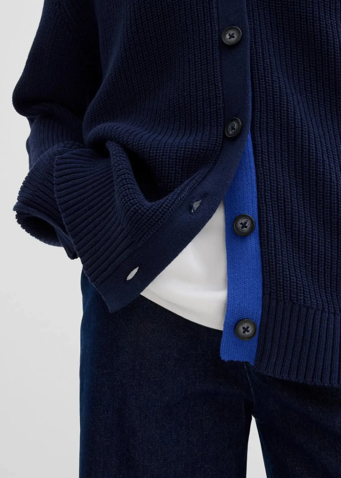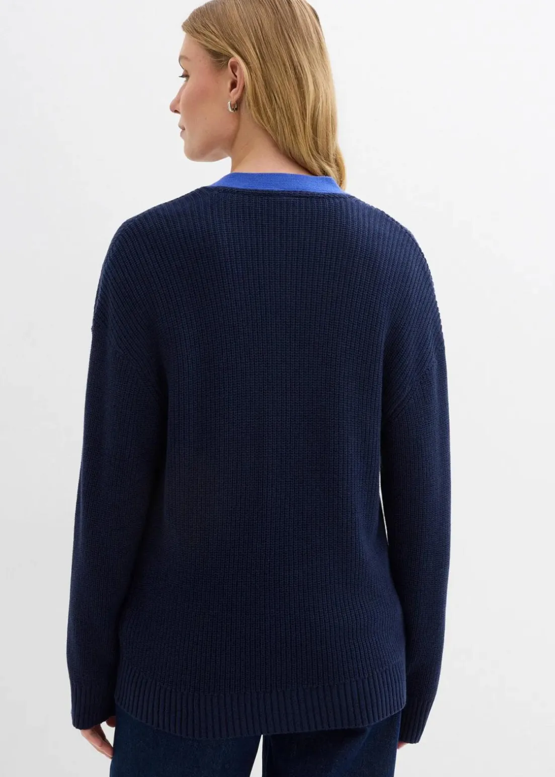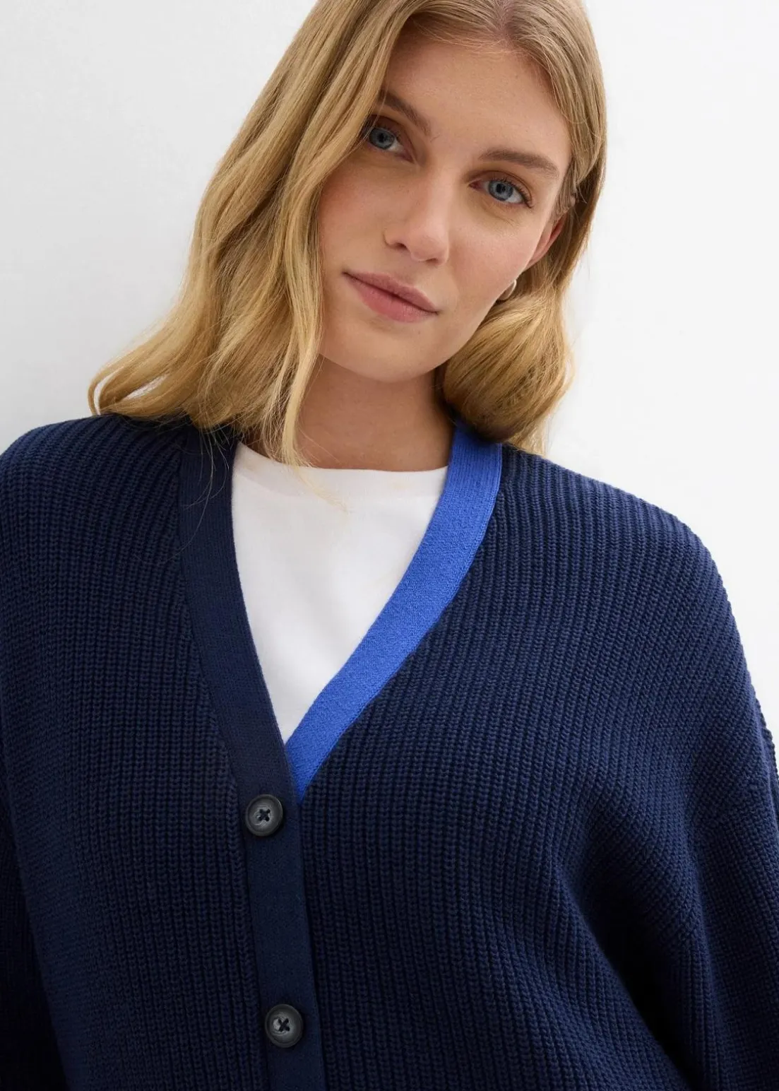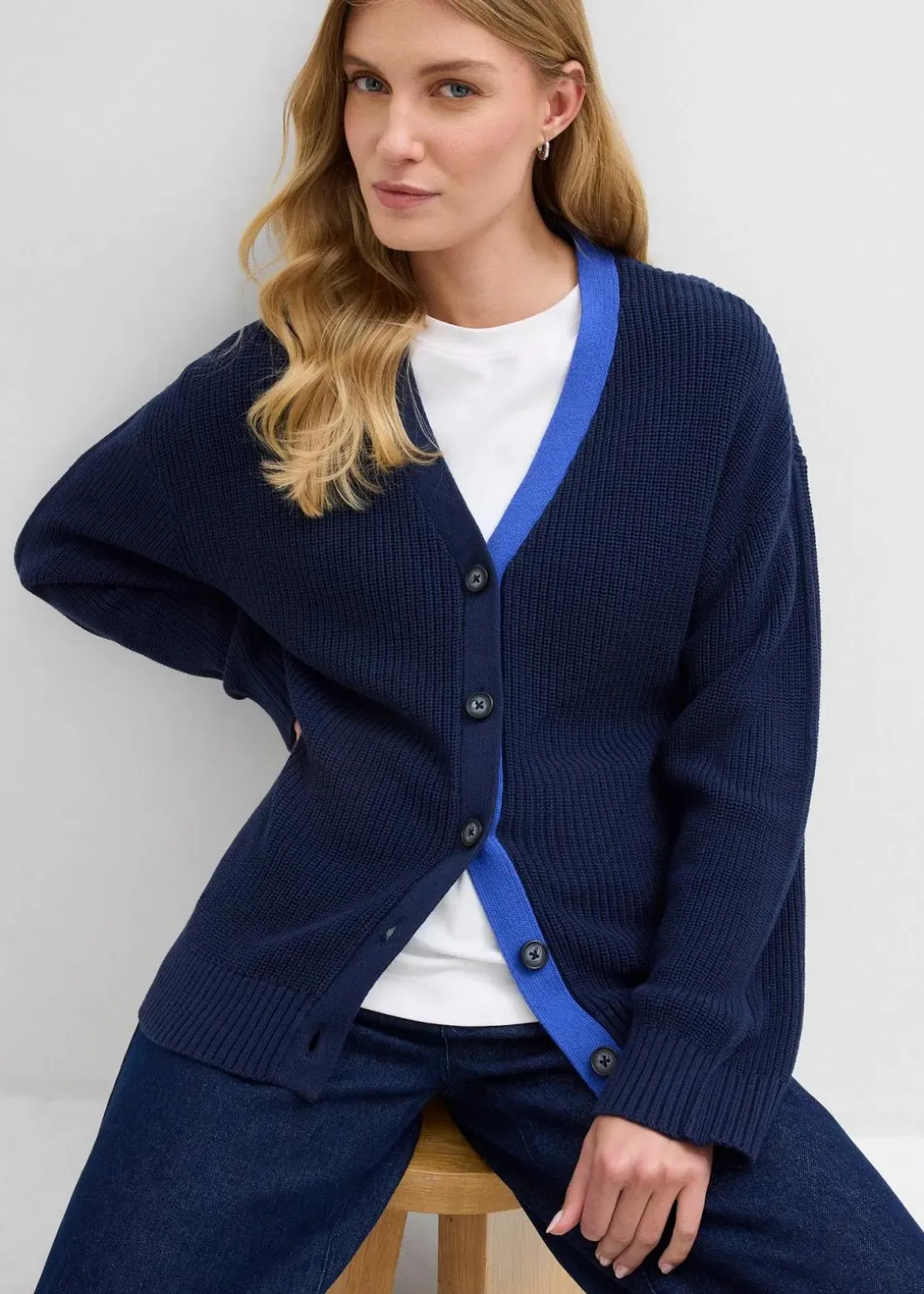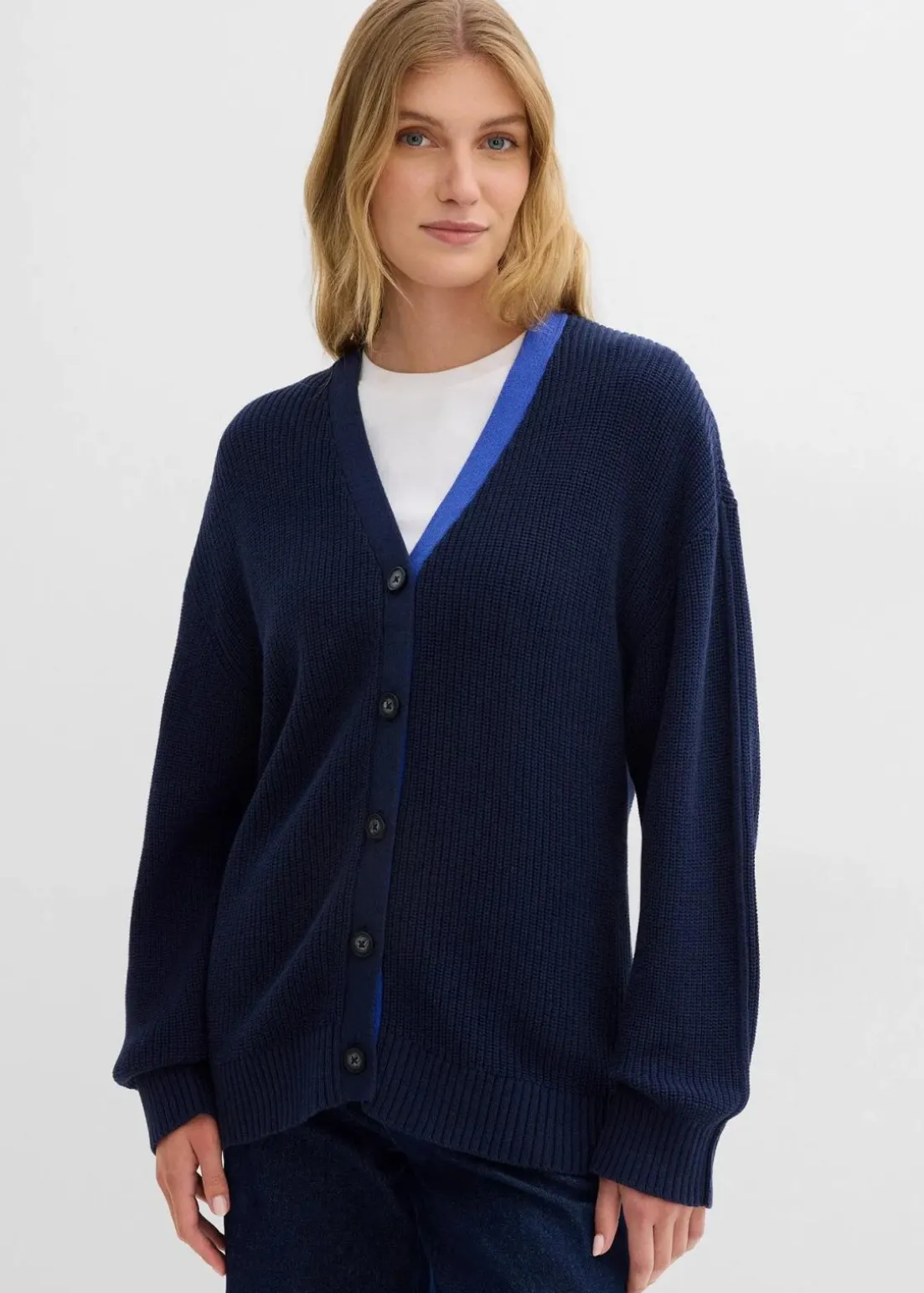 Loose-Fit Cardigan mit V-Ausschnitt sowie kontrastfarbiger Knopfleiste vorne und überschnittenen Schultern