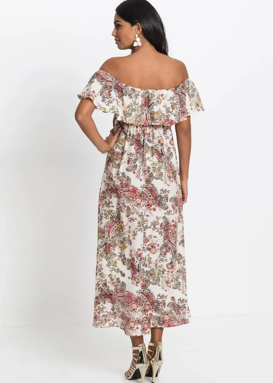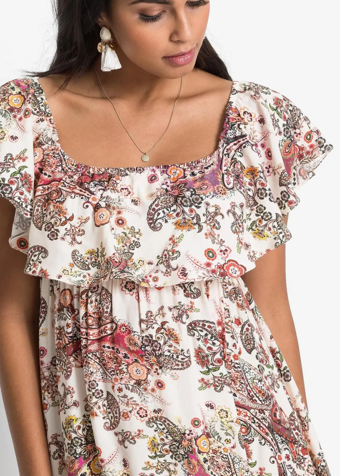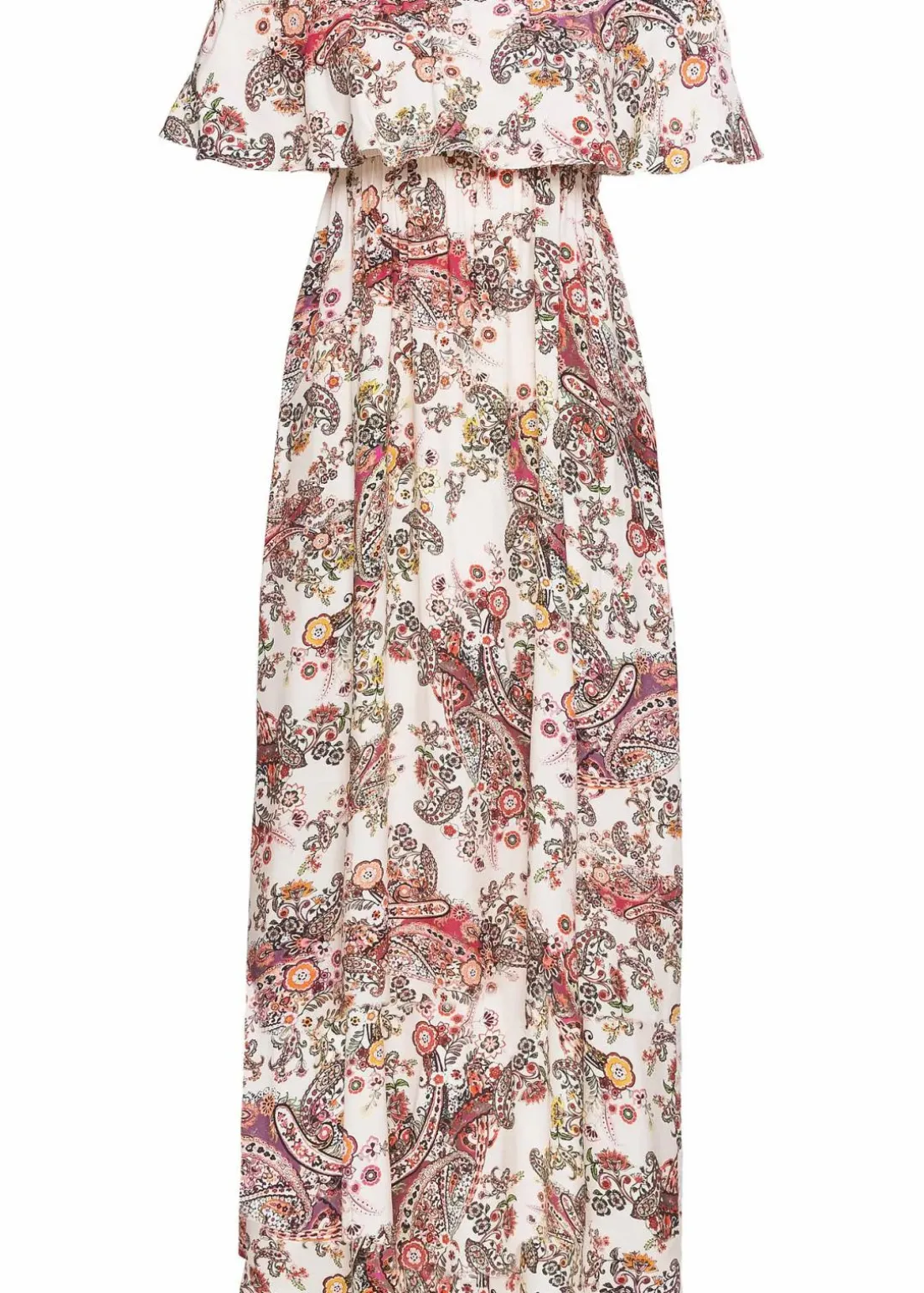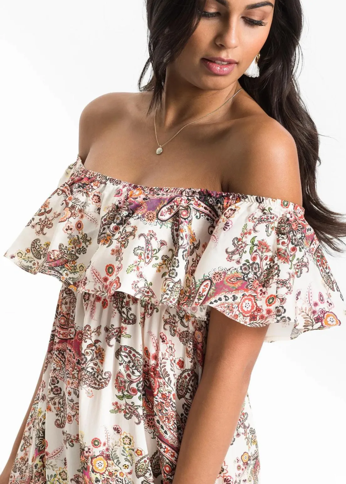 Dieses schöne Carmen-Kleid der Marke BODYFLIRT versprüht Leichtigkeit und punktet mit seinem romantischen Stil. Das lange Kleid setzt durch den hübschen Carmen-Ausschnitt die Schulterpartie in Szene und ist ebenso gut auf den Schultern tragbar. Die Ärmel und den Ausschnitt ziert ein großer Volant, der das verspielte Design des Kleids wunderbar unterstreicht. In der Taille ist das Modell schmaler geschnitten und hebt die Körpermitte sehenswert hervor, während es die Beine locker umspielt.