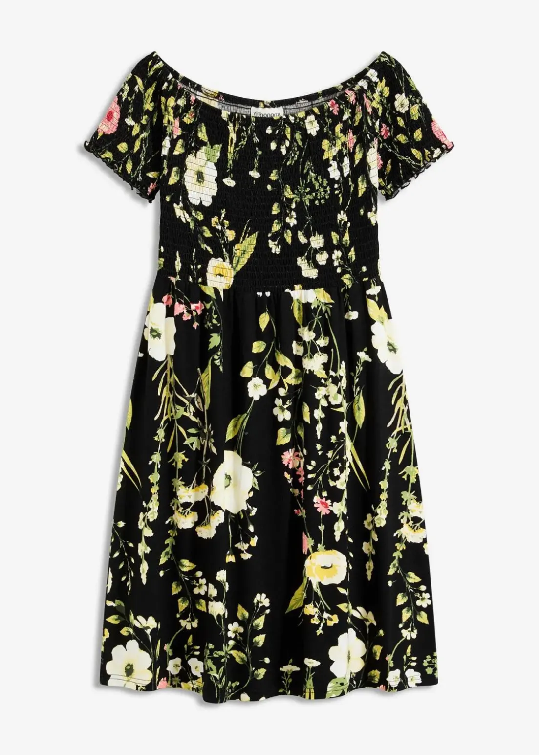 floral bedrucktes Carmen-Jerseykleid aus softem Viskose-Mix mit Smok im Oberteil