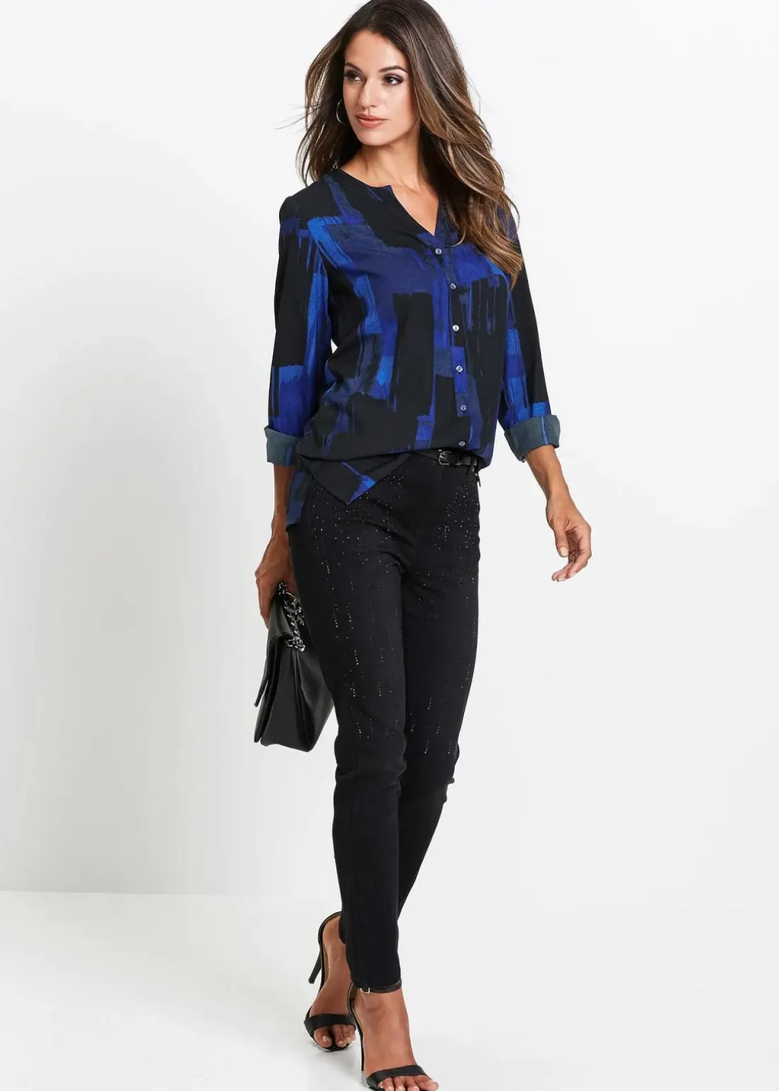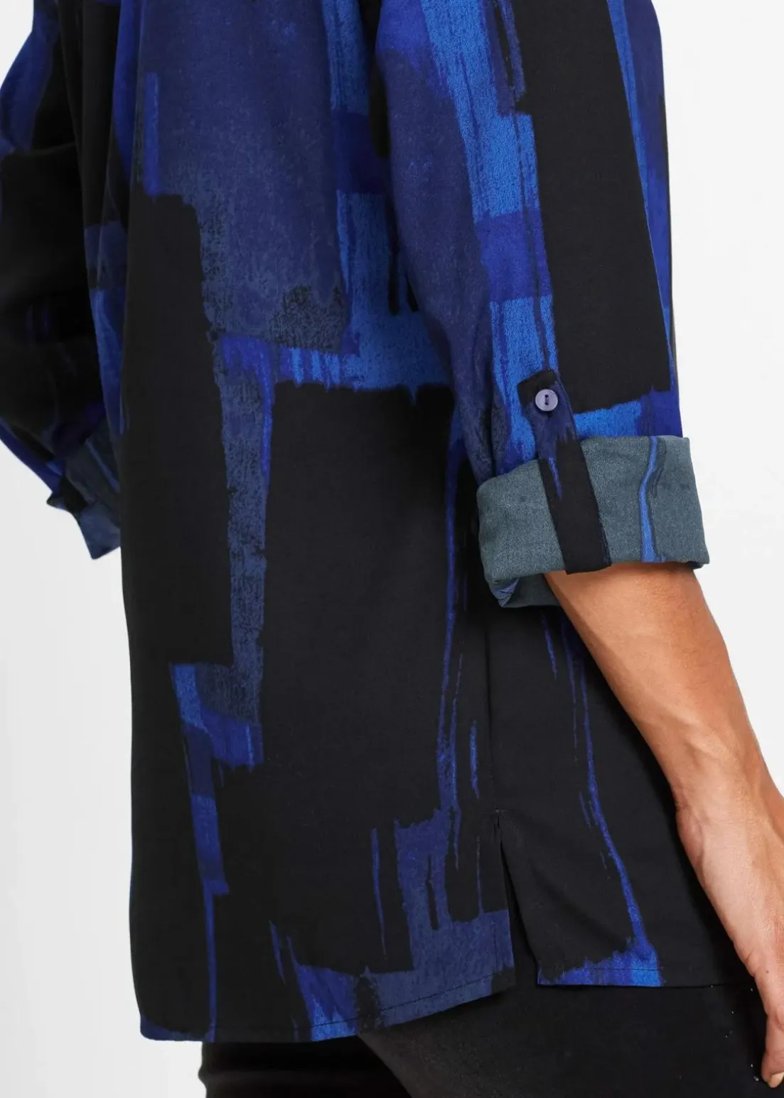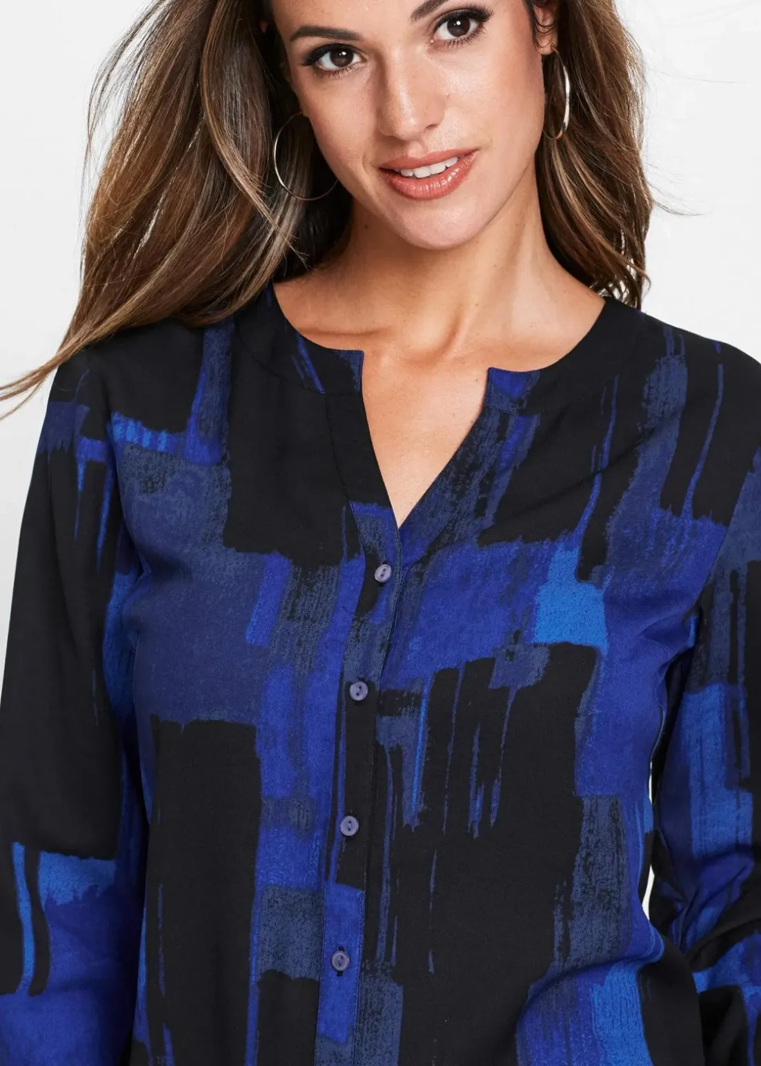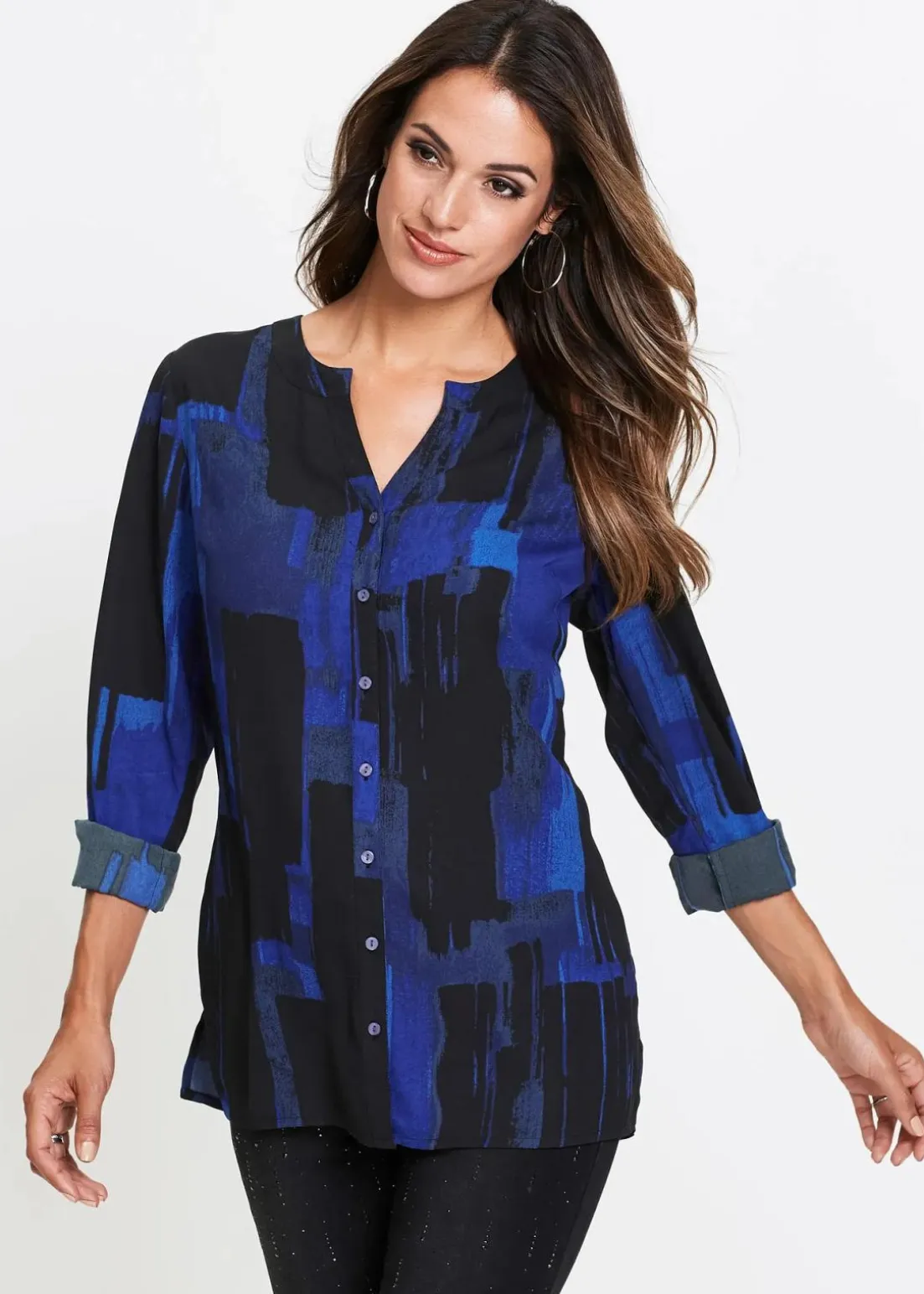 In trendigem Druck, mit kleinem Stehkragen und Knopfleiste vorn, Langarm mit Krempelfunktion, kleine Seitenschlitze, Länge von ca. 69 cm (Gr.36) bis ca. 78 cm (Gr.54), maschinenwaschbar,