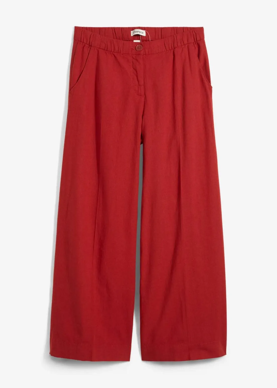 Knöchellange Hose mit weitem Bein und mittelhohem Bund , seitlichen Taschen und aufgesetzter Gesäßtasche. Frontverschluss mit Reißverschluss und Knopf