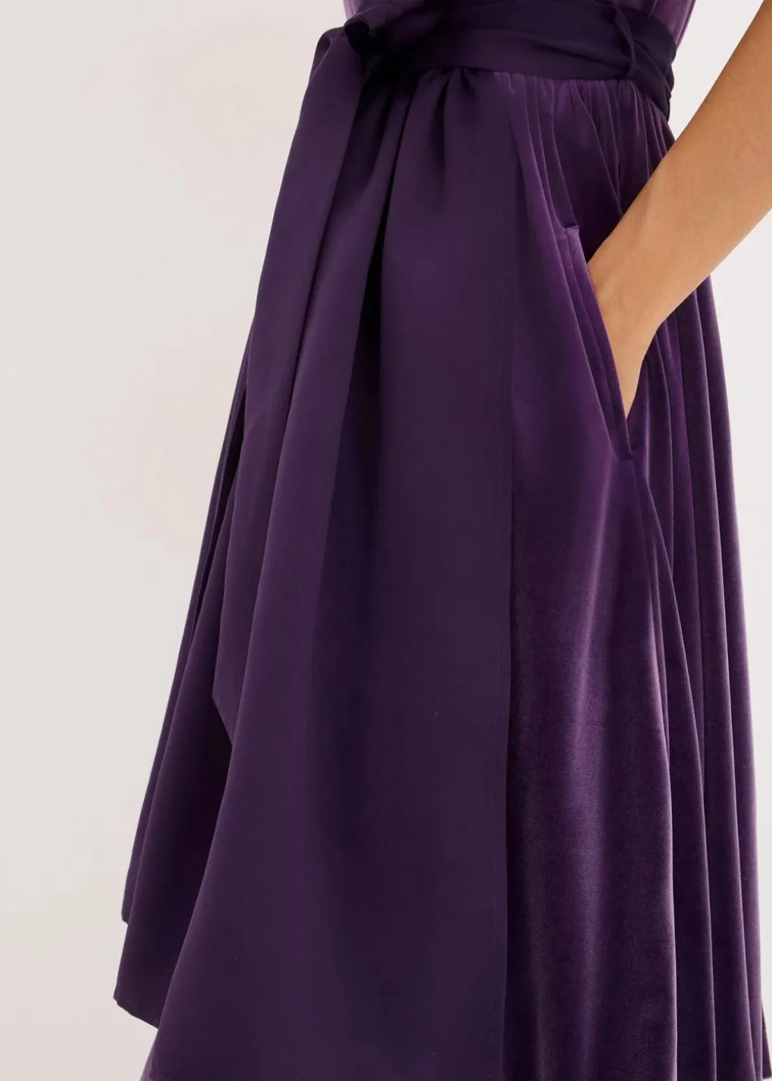 Modern und feminin: Dirndl aus Samt mit herzförmigen Ausschnitt und Ballonärmel sowie einer Schürze aus glänzendem Satin