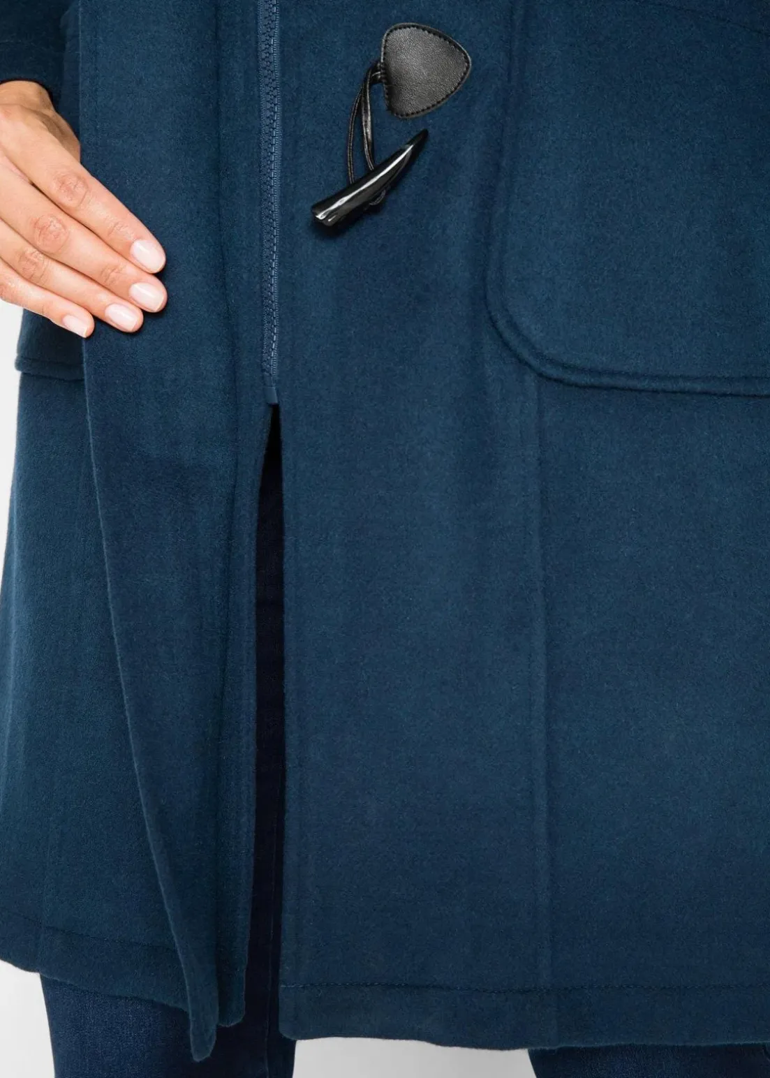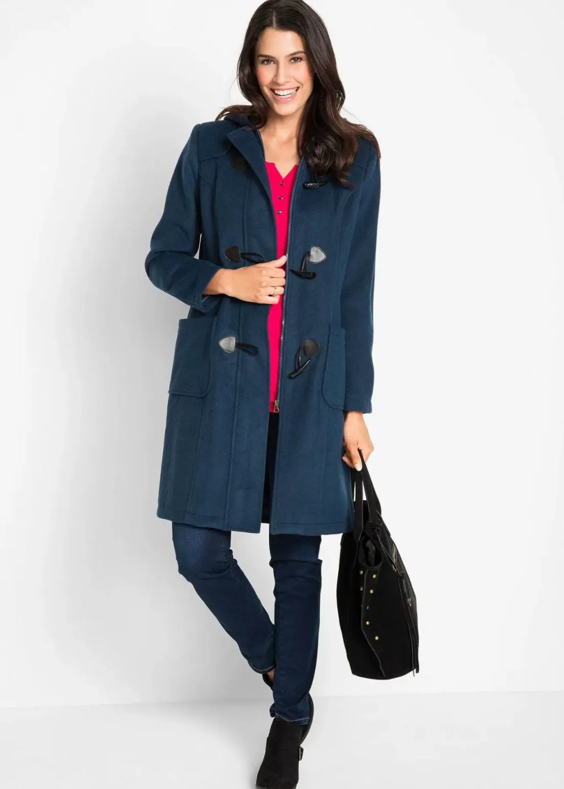 Schöner Dufflecoat mit auffallenden Knebelknöpfen umspielt die Figur