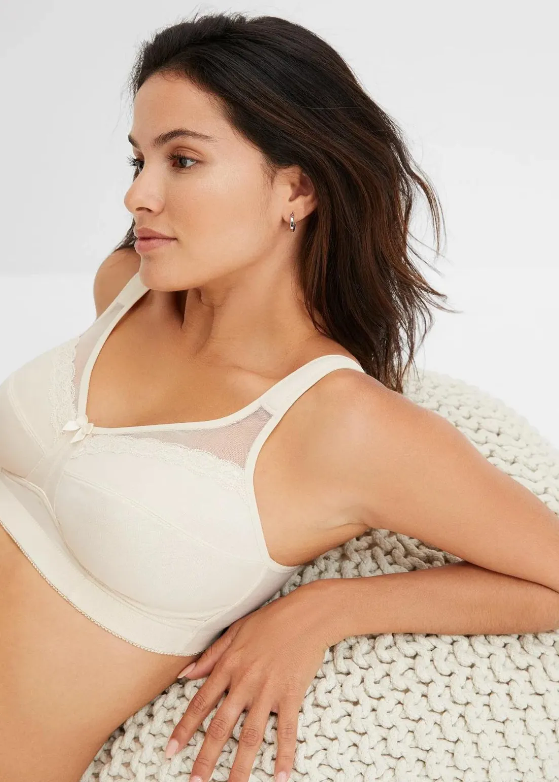 Edler Entlastungs BH ohne Bügel mit modernem Spitzenband und Mesheinsatz am oberen Cup. Breite, gepolsterte Träger sorgen für hohen Tragekomfort.