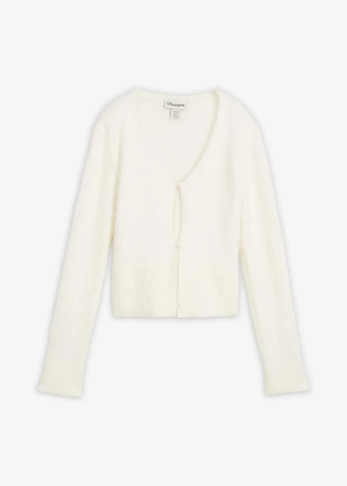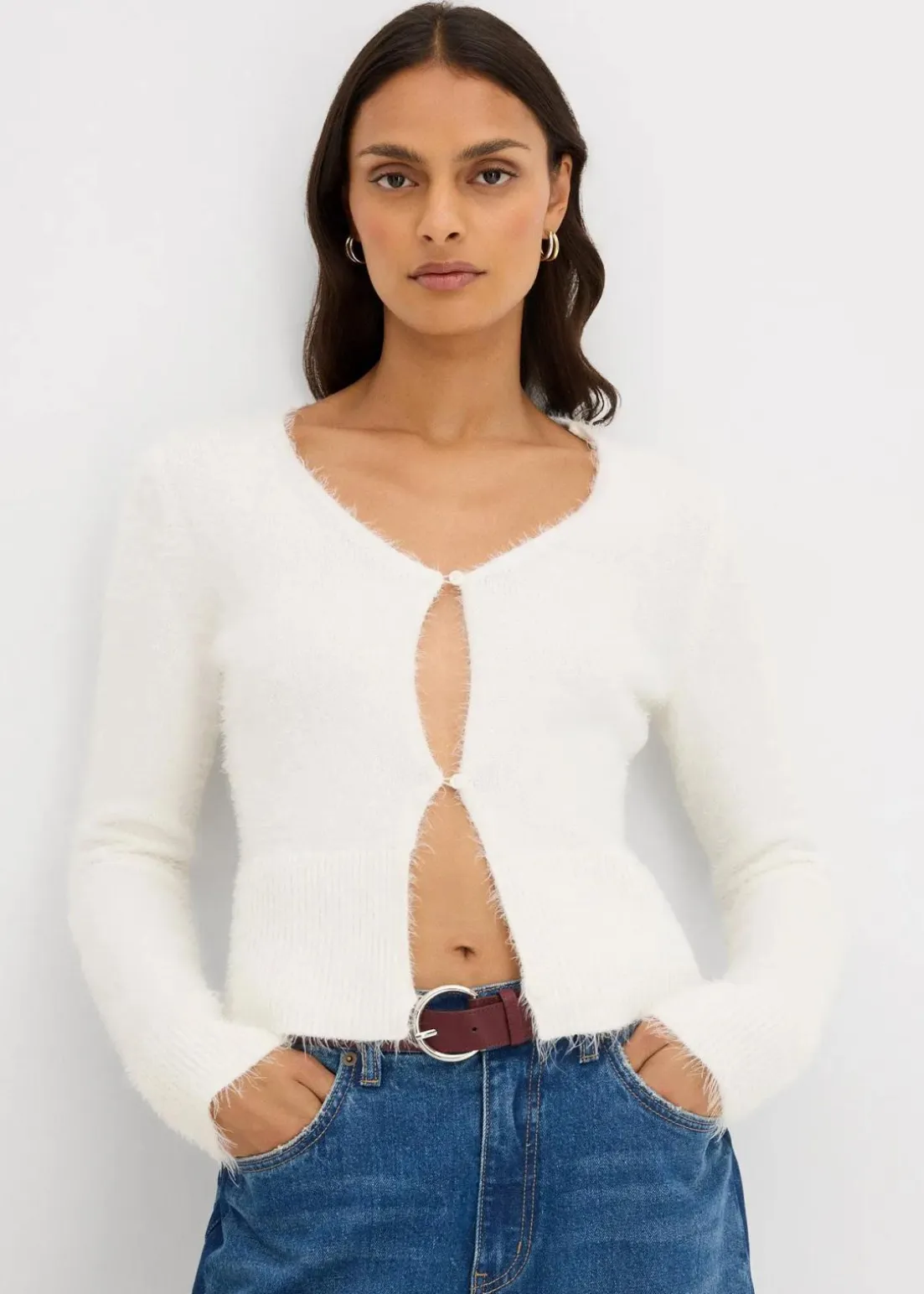 Modische Feinstrickjacke aus Federgarn und tiefem Ausschnitt