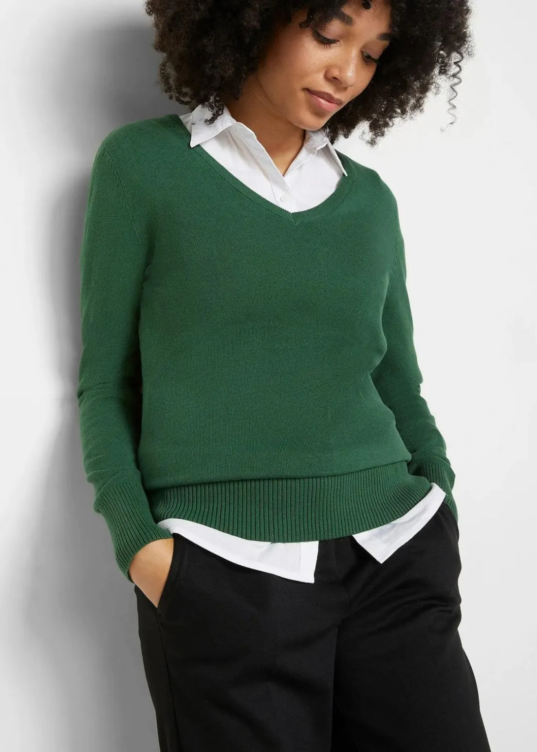 Das bequeme Feinstrick-Material und der klassisch figurbetonte Schnitt machen diesen V-Pullover zum tollen Begleiter für die Freizeit. Der tiefe Ausschnitt sorgt für einen legeren und natürlichen Look.Das Bündchen und die Ärmelsäume sind schön breit und wirken unaufdringlich und lässig. In Kombination mit sportlichen Cargo-Hosen oder ausgestellten Röcken sieht dieser V-Pullover von bpc einfach am besten aus.