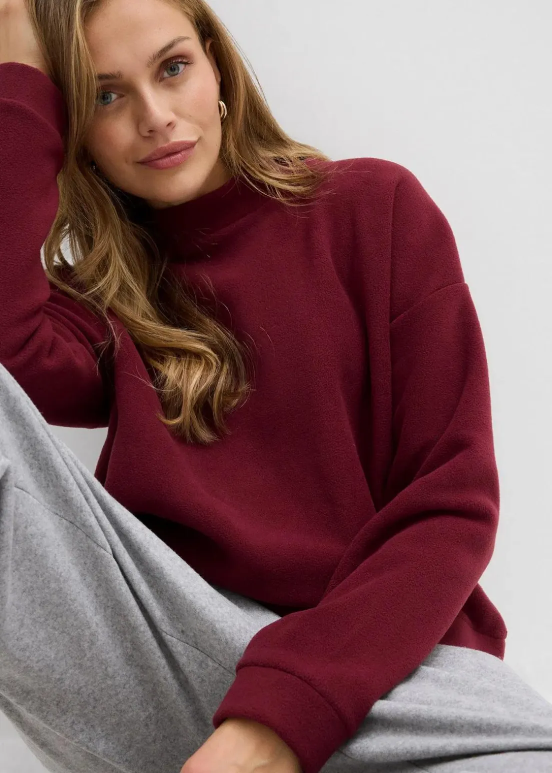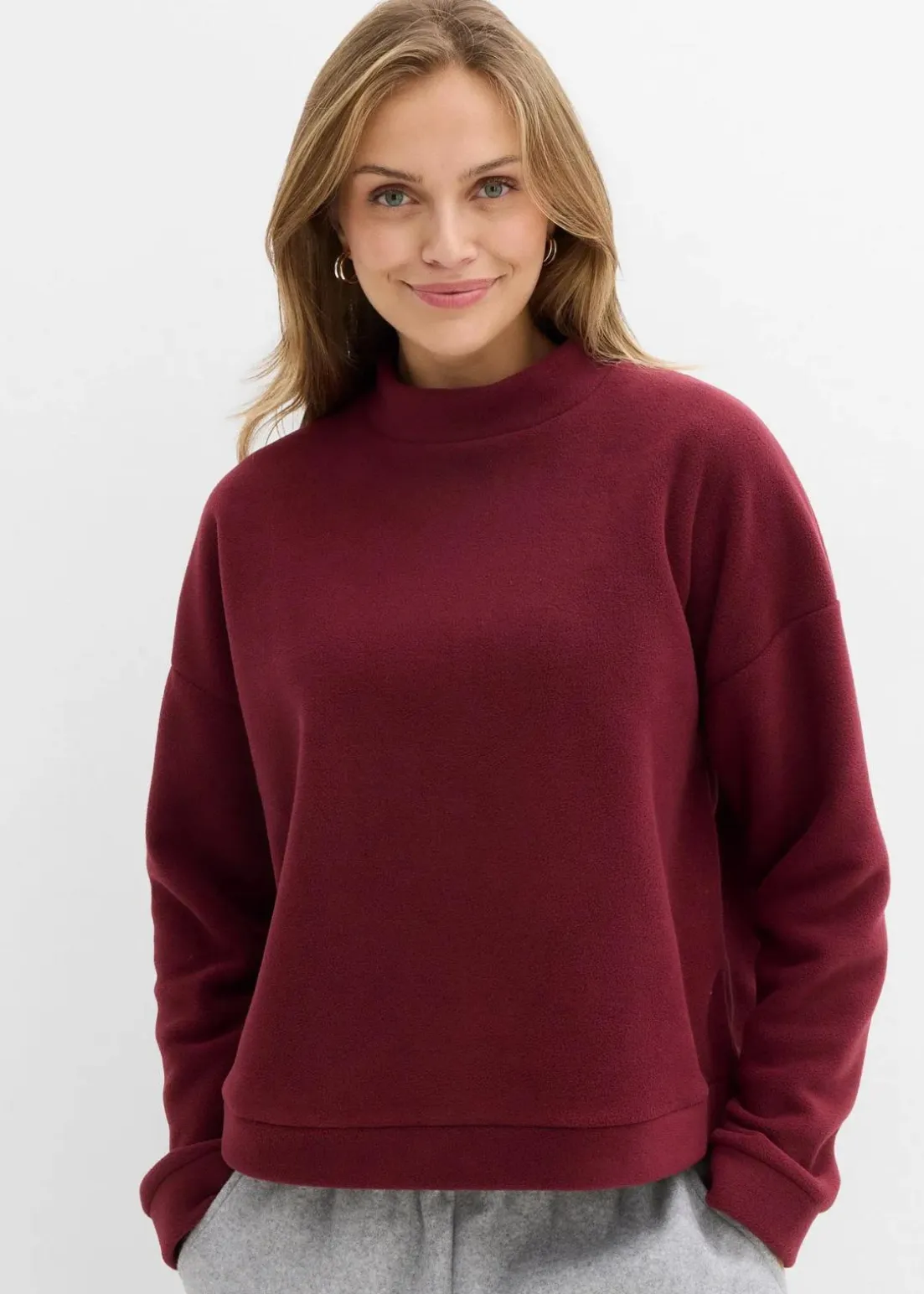 Fleecepullover in weiter Passform. Mit Stehkragen und überschnittener Schulter.