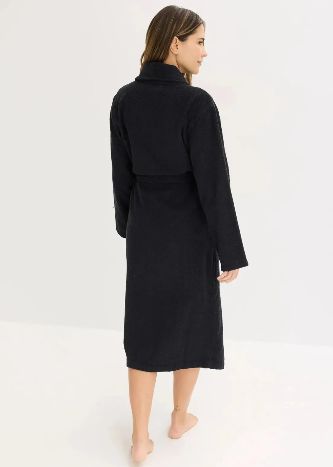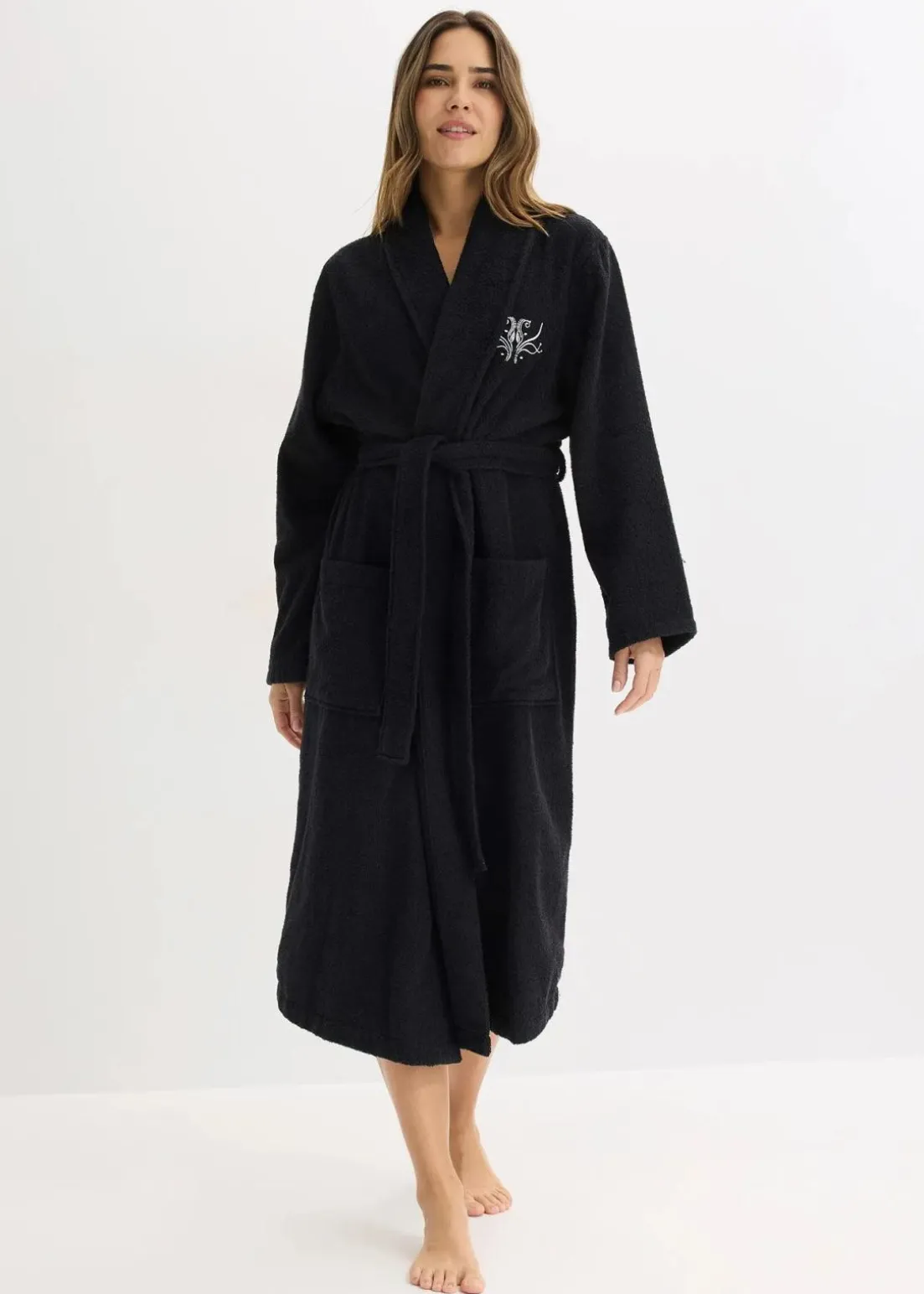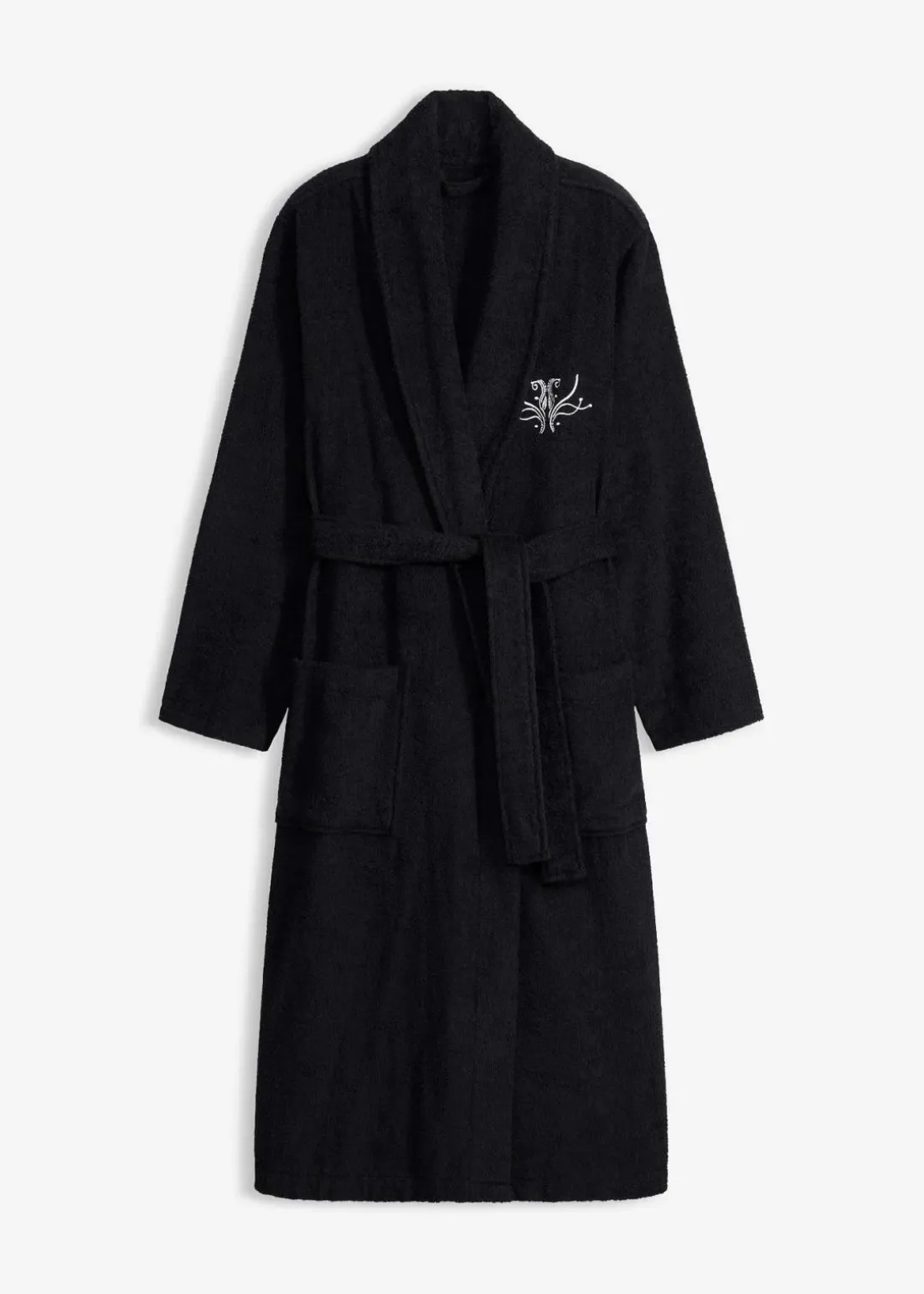 Der Frottee Bademantel ist aus flauschiger Baumwolle gefertigt und sorgt für ein behagliches Tragegefühl. Das schöne Modell zeigt sich im klassischen Schnitt mit einem Bindeband zum Fixieren und mit zwei aufgesetzten Taschen vorne. Die kleine Stickerei neben dem Kragen setzt einen stilvollen Akzent. Als komfortabler Begleiter beim Saunagang macht der Bademantel eine gute Figur.