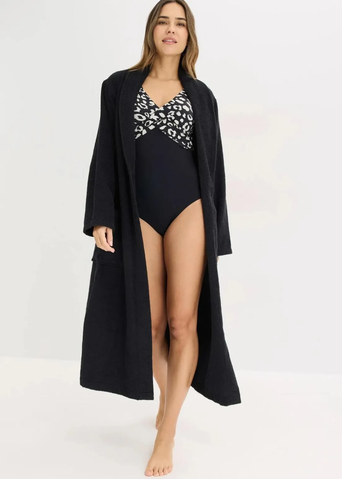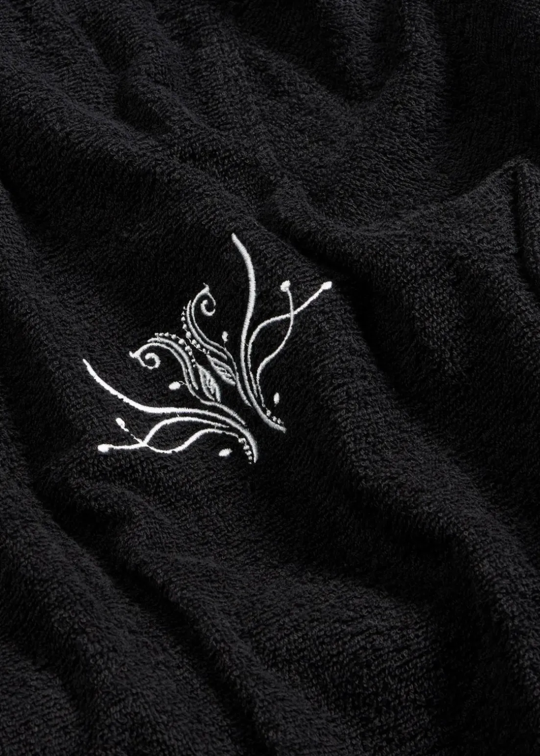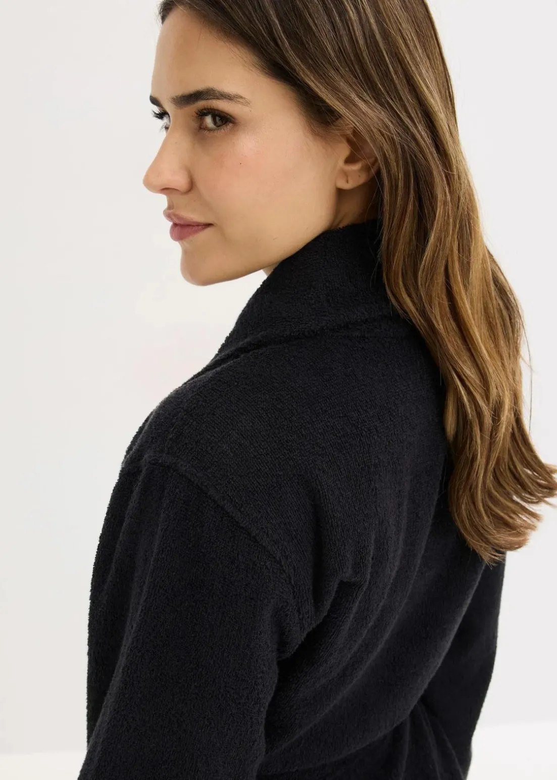 Der Frottee Bademantel ist aus flauschiger Baumwolle gefertigt und sorgt für ein behagliches Tragegefühl. Das schöne Modell zeigt sich im klassischen Schnitt mit einem Bindeband zum Fixieren und mit zwei aufgesetzten Taschen vorne. Die kleine Stickerei neben dem Kragen setzt einen stilvollen Akzent. Als komfortabler Begleiter beim Saunagang macht der Bademantel eine gute Figur.