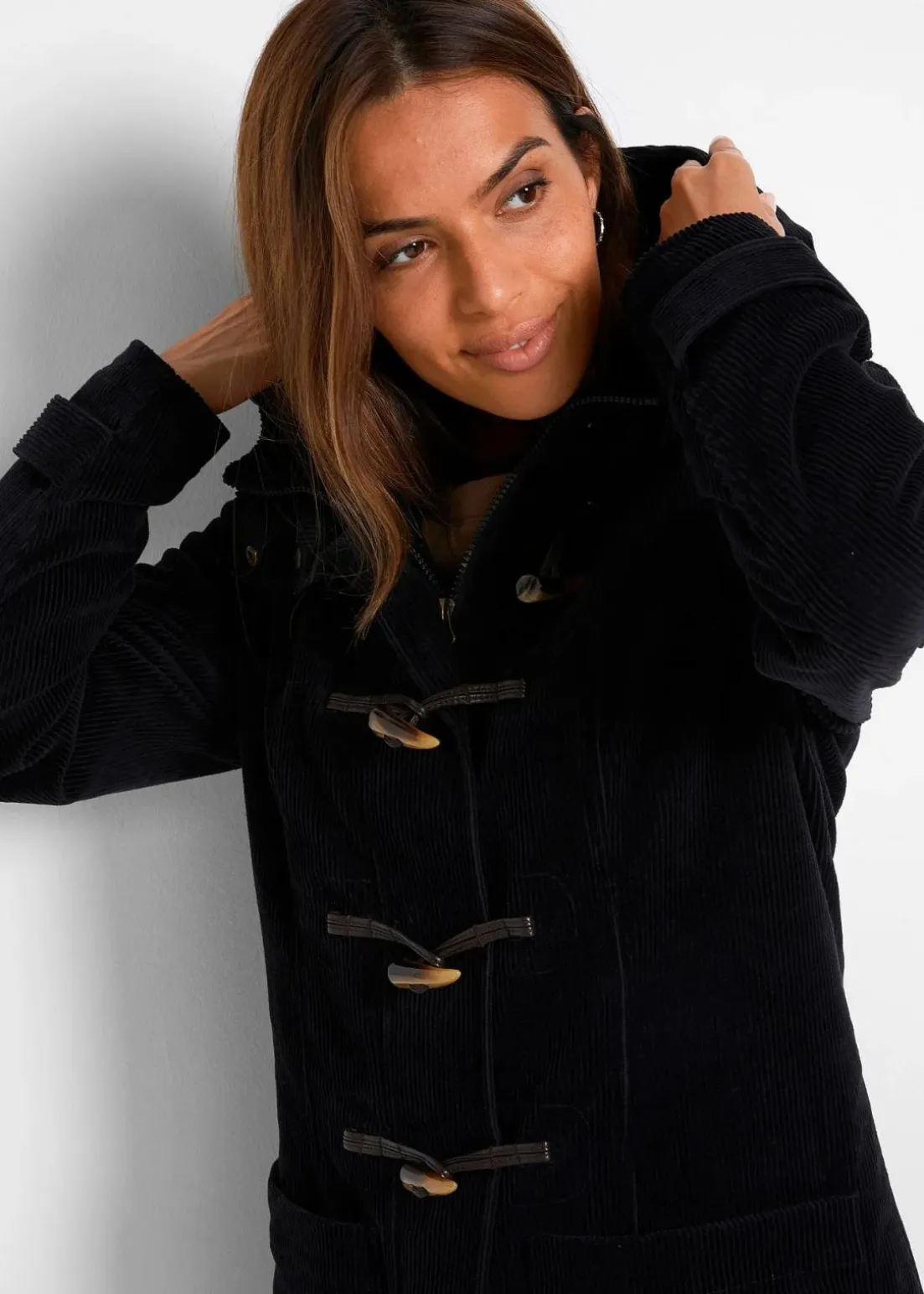 Gefütterter Cord-Dufflecoat mit Kapuze und Knebelknöpfen