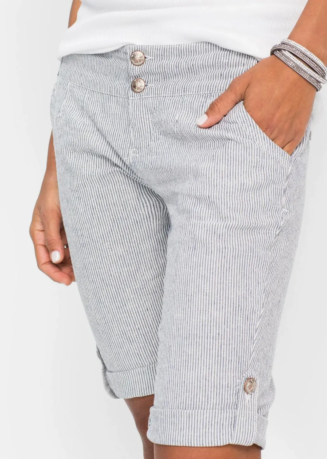 Diese stylishen Shorts mit feinen Streifen verschaffen langen Beinen einen großen Auftritt: Die schmal geschnittene Hose in 3/4-Länge lässt sich bis auf Bermuda-Länge krempeln und mit Knopf und Riegel fixieren. Der breite Taillenbund mit Gürtelschlaufen schließt vorne mit zwei Knöpfen.Die gestreiften Shorts lassen sich zu Tops, Blusen und Shirts tragen.