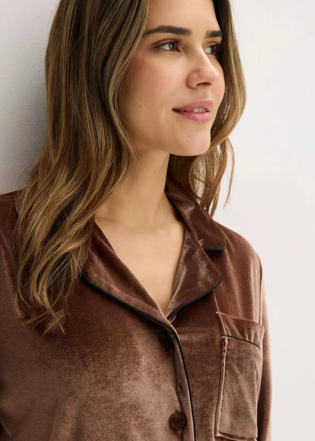 Hausanzug aus Samt mit Reverskragen und seitlichen Eingriffstaschen an der Hose