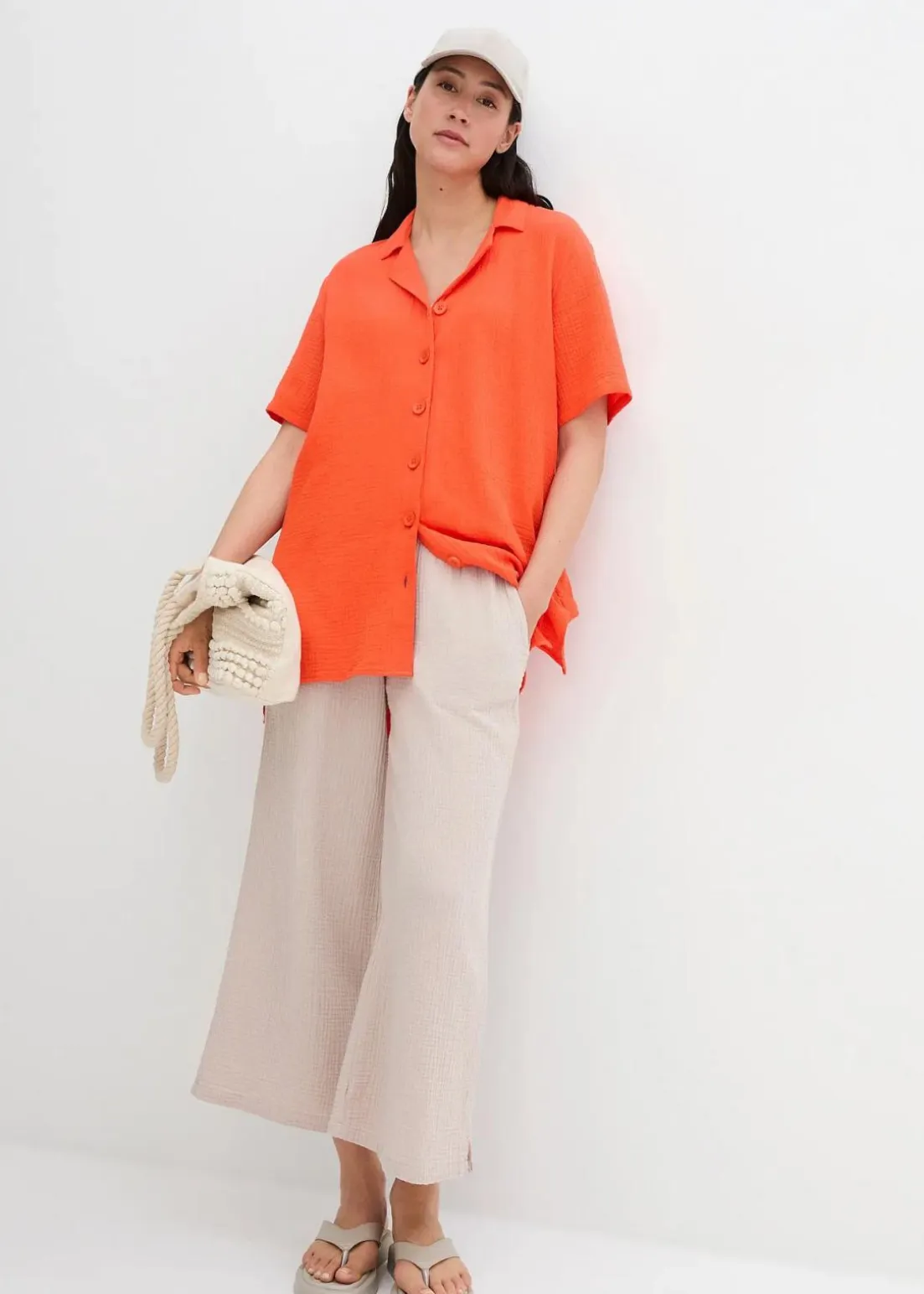Kurzarmhemd mit überschnittener Schulter und verlängertem Rückensaum. Weite Passform.