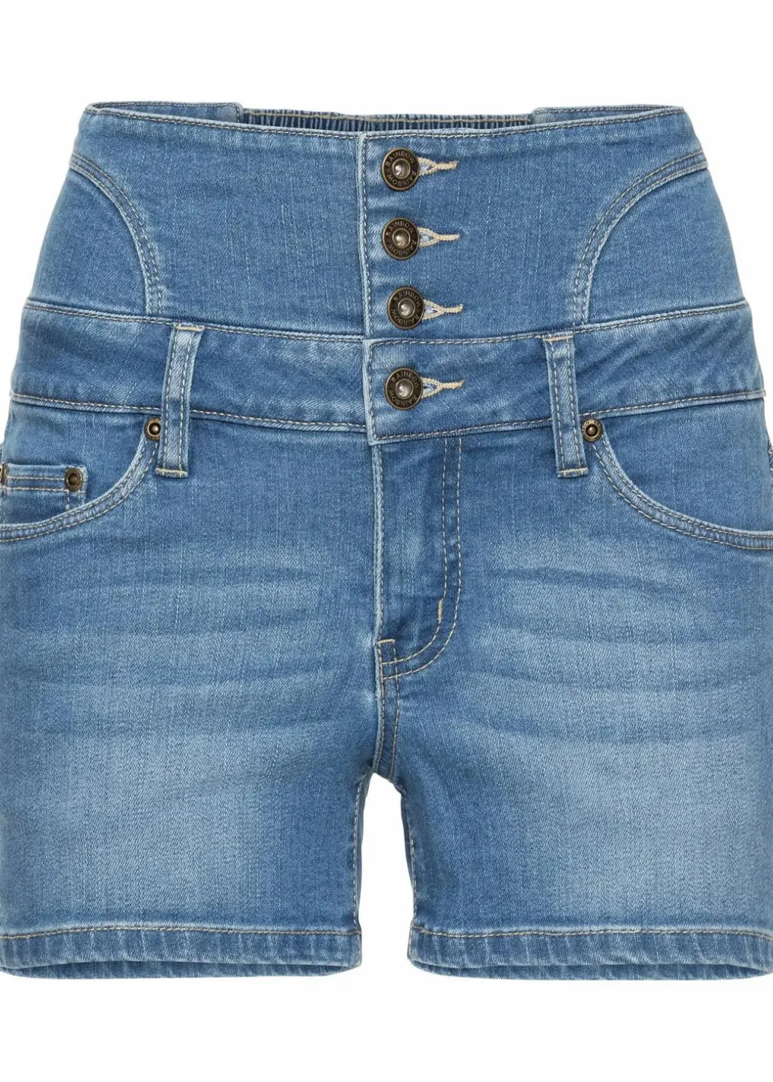 Ein mit drei Knöpfen verzierter Einsatz verwandelt ein Basic in einen trendstarken Hingucker. Seitliche Teilungsnähte unterstreichen den coolen Charakter des Modells. Den letzten Schliff erhalten die Highwaist-Jeans-Shorts im typischen 5-Pocket-Look mit einem gesmokten Einsatz auf der Rückseite.Ein Bandeau-Top und ein Longcardigan in Netzoptik begleiten die Highwaist-Jeans-Shorts auf besonders angesagte Weise. Ein lässiger Style gelingt mit Boxy-Shirt und Sneakern.