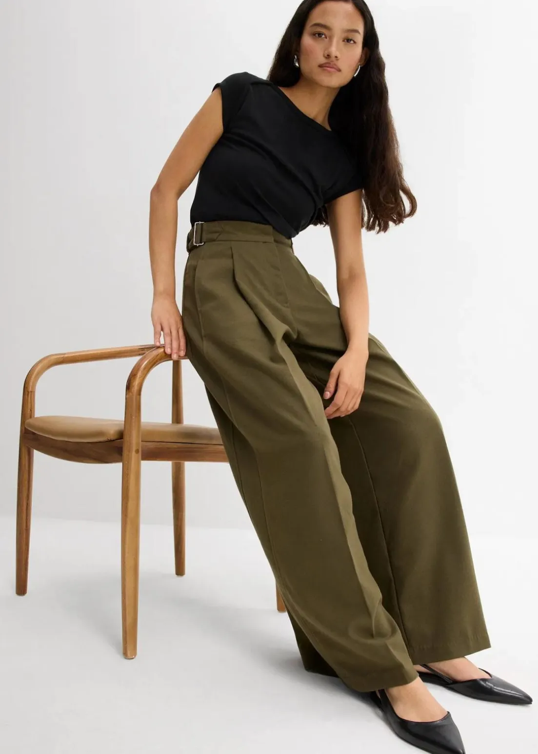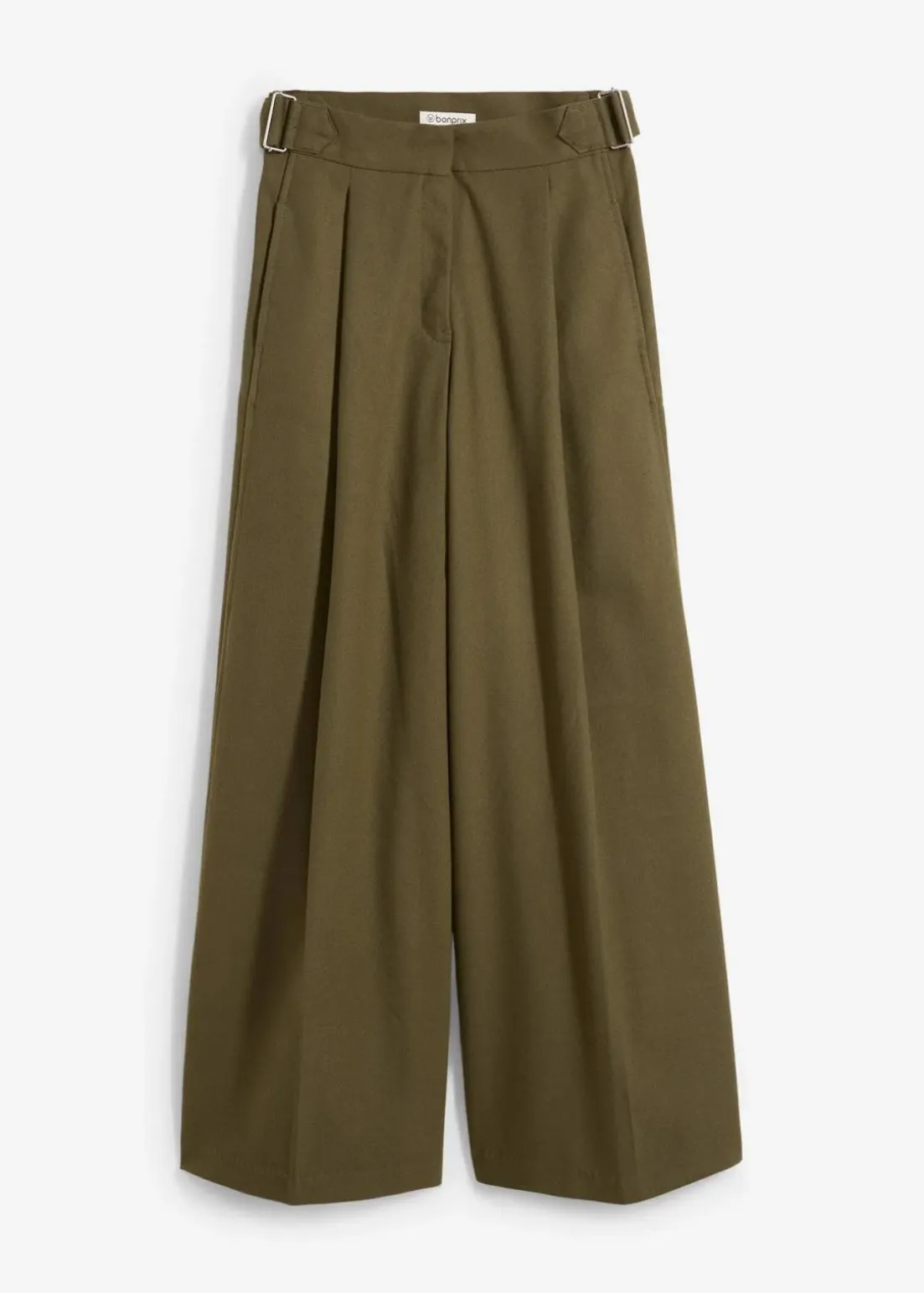 Locker geschnittene Hose mit Bundfalten und Bügelfalte vorne und hinten. Dezente Seitentaschen und ein verstellbarer Riegel mit Metallschnalle an beiden Seiten des Bunds.