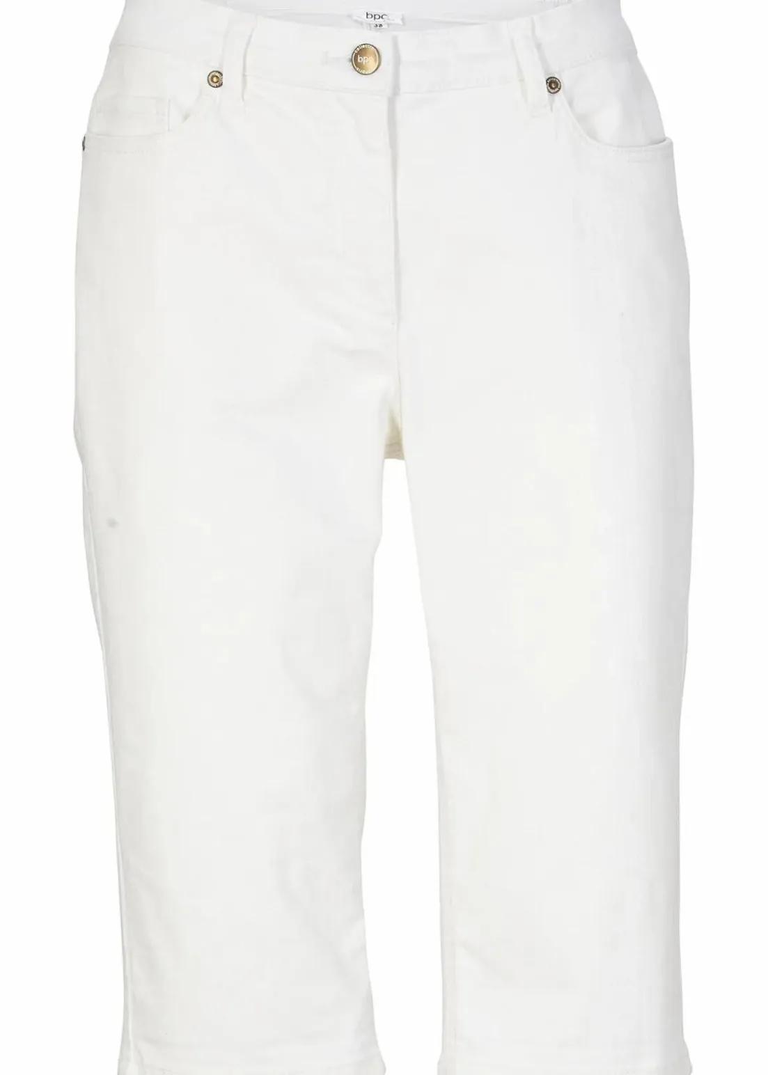 Die bequeme Stretchjeans-Bermuda von bpc ist ein vielseitiges Modeteil. Dank des hohen Teilgummibundes und des praktischen Verschlusses mit Knopf und Zipper trägt sich das Modell sehr komfortabel. Dekoratives Detail der Hose im Five-Pocket-Stil mit Gürtelschlaufen ist der hochgeschlagene Beinabschluss. Der dehnbare Stoff sorgt für einen angenehmen Sitz der figurnahen Bermuda.