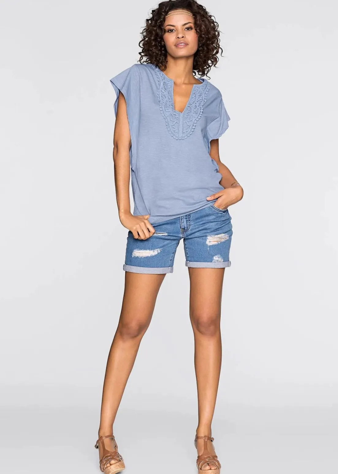 Angesagte Destroyed-Effekte sorgen bei dieser coolen Jeans-Shorts für eine hochmodische Note. Die etwas länger geschnittenen Beine lassen sich auf verschiedene Weise krempeln.Mit Ethno-Shirt, Fransentasche, Flechtsandalen und viel Schmuck entsteht ein trendiger Hippie-Look. Tanktop und Sneaker sehen zu der kurzen Jeans-Shorts sehr locker aus. Etwas verspielter wirkt das Modell mit einer bunten Tunika.