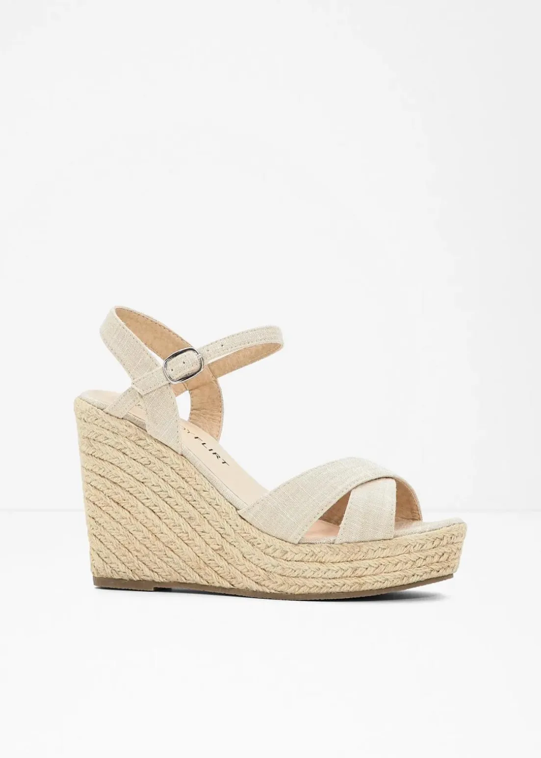 Süße Keilsandalette mit Bastabsatz und gekreuzten Riemen vorne