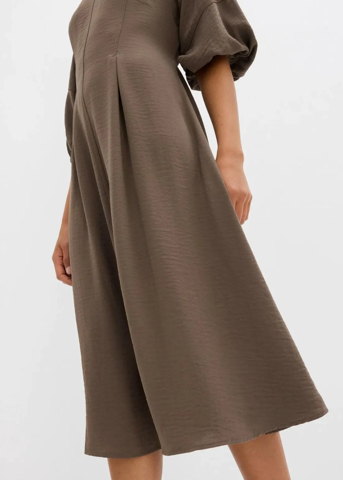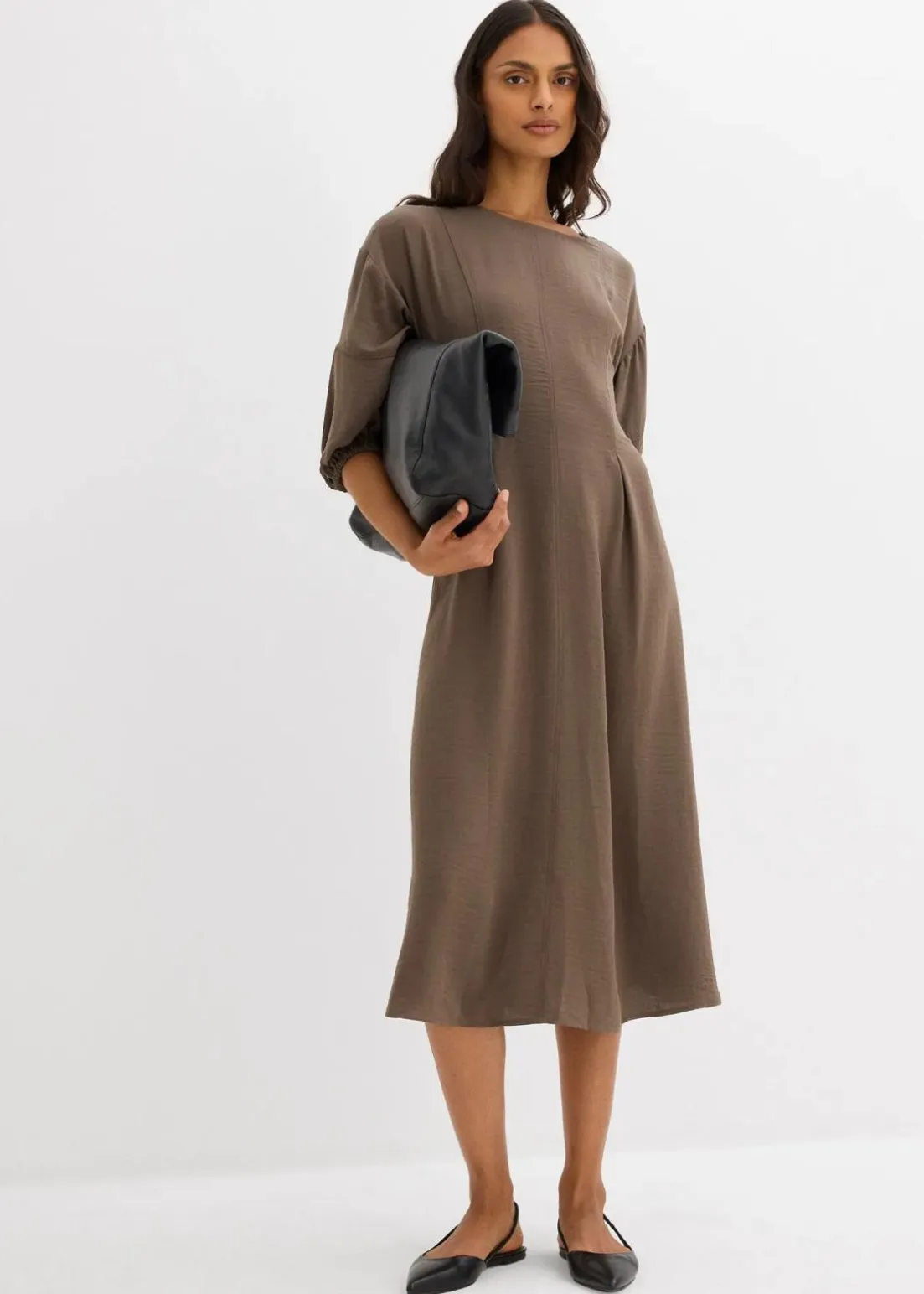 Midi-Kleid aus Webstoff mit rundem Ausschnitt und verlängerten kurzen Ärmeln mit Gummizug. In der Taille ein abnehmbarer Gürtel sowie ein verdeckter Reißverschluss hinten