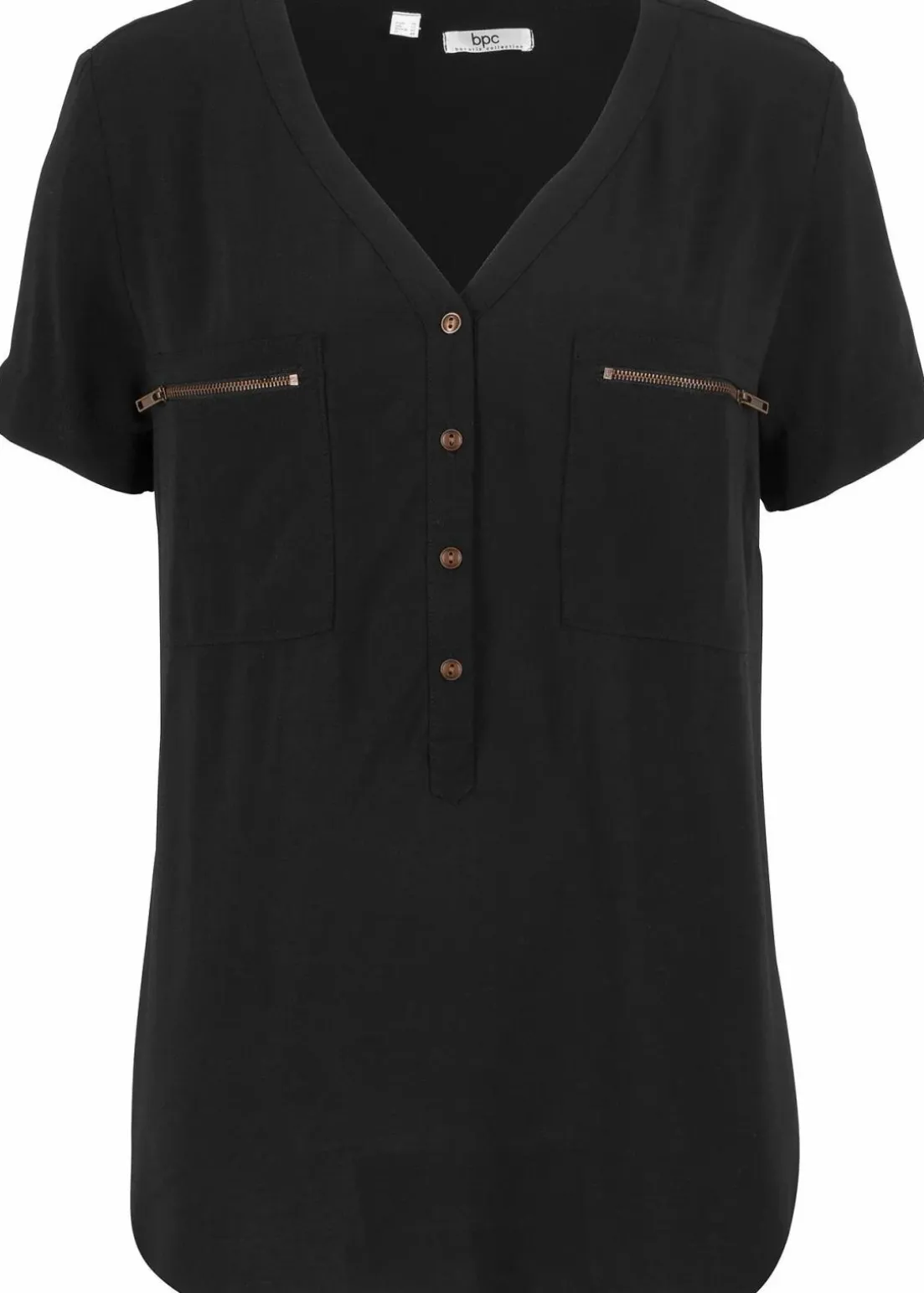 Die lockere Schnittform und die angenehme Viskose-Qualität machen diese Bluse von bpc zu einem gern getragenen Kleidungsstück für den Alltag. Der ansprechende V-Ausschnitt setzt sich in einer kleinen Knopfleiste fort, mit deren Hilfe er sich individuell regulieren lässt. Als weitere Blickfänger dienen die beiden Brusttaschen mit Reißverschluss.Der leicht abgerundete rückwärtige Saum komplettiert das attraktive Design der Viskose-Bluse mit halblangen Ärmeln.