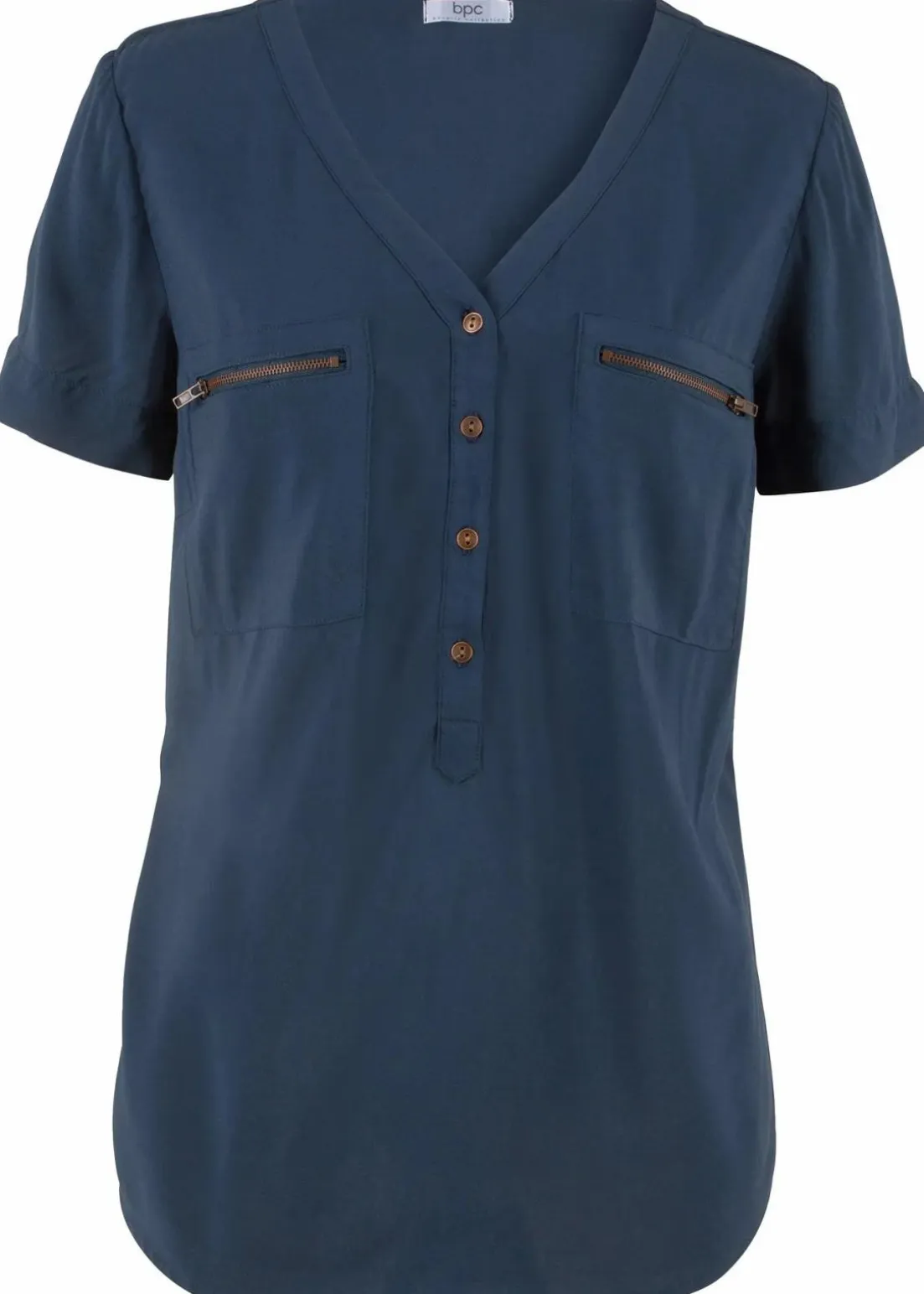 Die lockere Schnittform und die angenehme Viskose-Qualität machen diese Bluse von bpc zu einem gern getragenen Kleidungsstück für den Alltag. Der ansprechende V-Ausschnitt setzt sich in einer kleinen Knopfleiste fort, mit deren Hilfe er sich individuell regulieren lässt. Als weitere Blickfänger dienen die beiden Brusttaschen mit Reißverschluss.Der leicht abgerundete rückwärtige Saum komplettiert das attraktive Design der Viskose-Bluse mit halblangen Ärmeln.