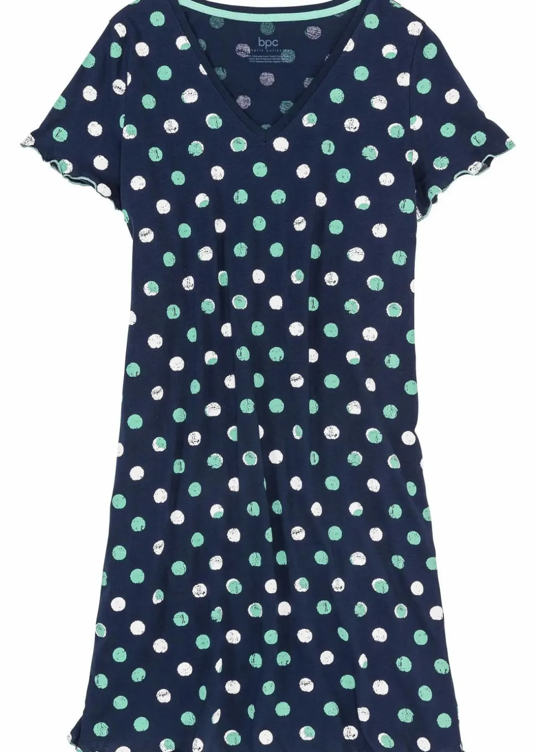 Dieses bequeme Nachthemd präsentiert sich ansprechend mit einem gerundeten V-Ausschnitt und kurzen Ärmeln. Das Longshirt umspielt schön die Figur. Mit seinem angenehm zu tragenden Baumwollmaterial gehört es zu den Basics im Kleiderschrank.Ein hübsches Detail bei diesem Modell sind die dekorativen Wellenkanten an Saum und Ärmelabschlüssen.