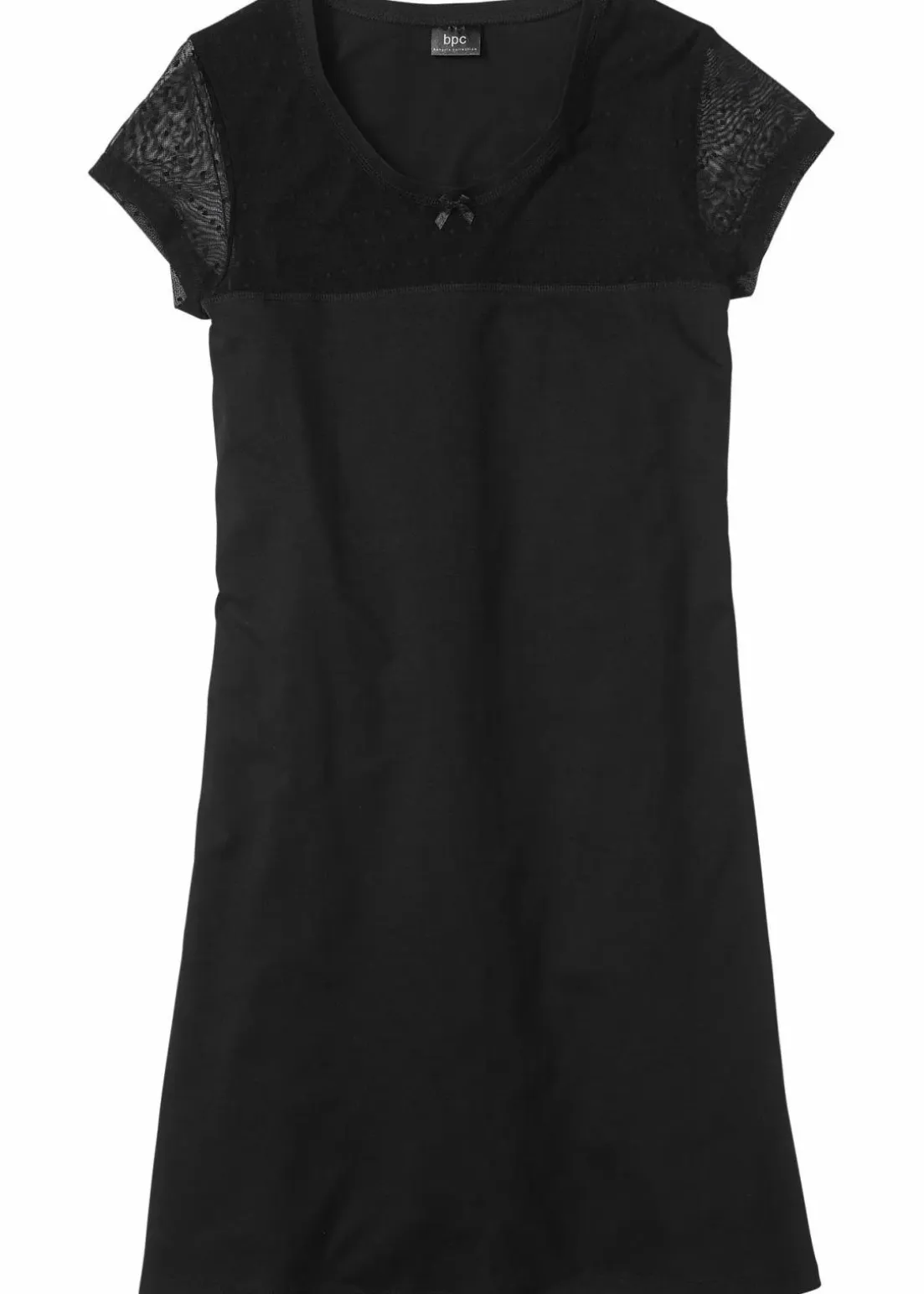 Dieses modische Hauskleid ist ein Lieblingsteil für die Nacht. Das kurze Longshirt überzeugt vor allem mit den transparenten Einsätzen auf der Vorderseite und an den Ärmeln. Diese Einsätze in Pünktchen-Optik sowie die kleine Satinschleife am Ausschnitt und die dezenten Seitenschlitze verleihen dem Nachthemd einen romantischen Look.