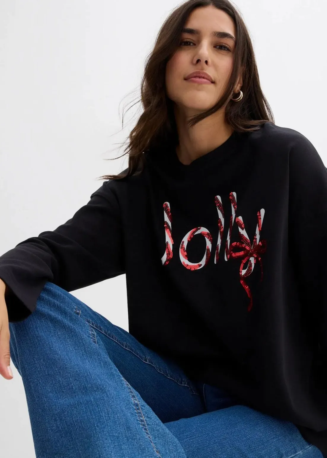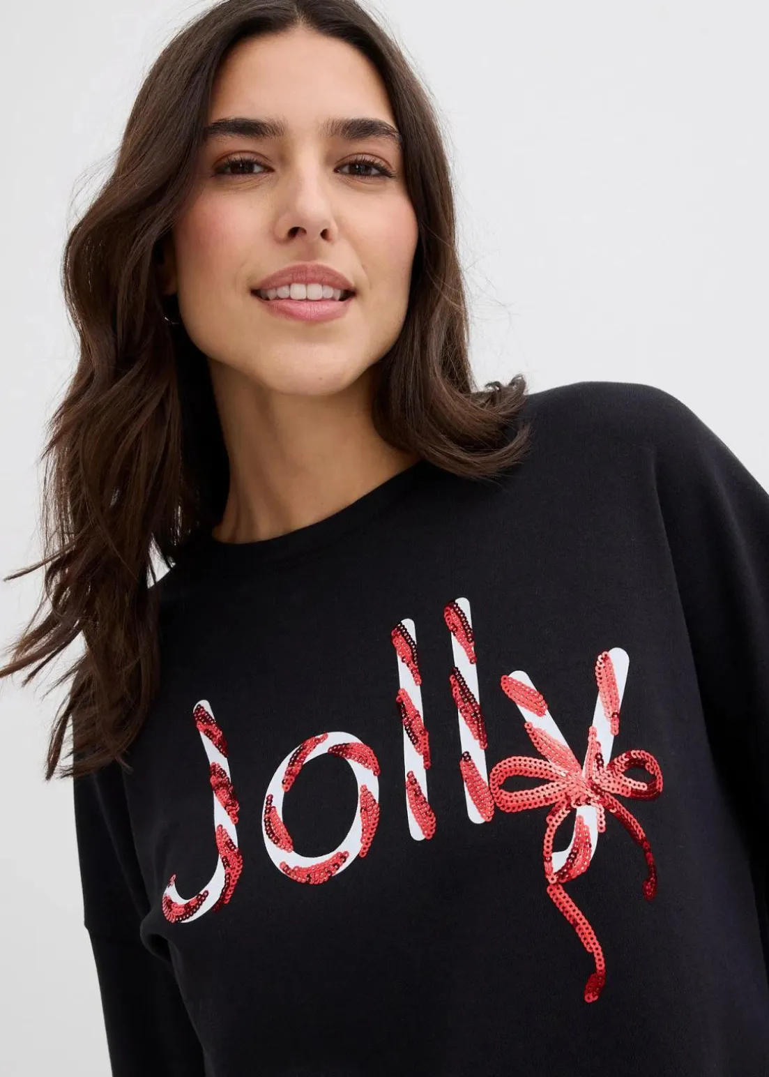 Weihnachtliches Baumwoll-Longsleeve mit Rundhals-Ausschnitt und Pailletten Schriftzug