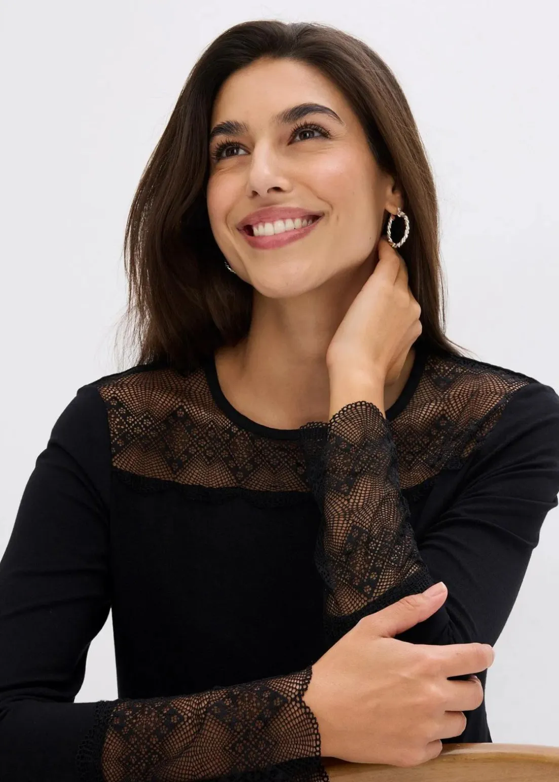 Langarmshirt mit dekorativen Spitzeneinsätzen